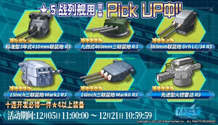 实施期间2018年12月05日(周三)11:00:00~2018年12月21日(周五)10:59:59•限定建造&特别开发计划内容本次限定建造计划中可以获得新队员 战列舰【密苏里】同时新追加的队员 轻巡洋舰【亚特兰大】的概率也将提升。☆☆☆☆☆ 战列舰 密苏里☆☆☆☆ 轻巡洋舰 亚特兰大特别开发计划中,10次连续开发必定获得1件4星以上装备。同时,以下战列舰装备的开发概率提升。☆