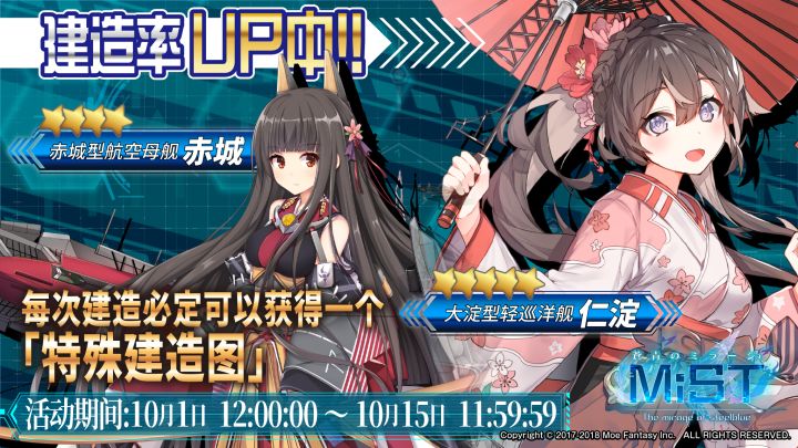 实施期间2018年10月1日(月)11:00:00~2018年10月15日(月)10:59:59(北京时间)2018年10月1日(月)12:00:00~2018年10月15日(月)11:59:59(日本时间)·限定建造・特别开发计划内容限定建造计划中可以建造以下队员。☆☆☆☆☆ 轻巡洋舰 仁淀 (CV:鬼頭明里)☆☆☆☆ 航空母舰 赤城特别开发计划中,10次连续开发必定获得1件4星以