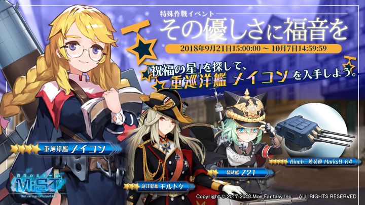 实施期间2018年9月21日(周五)14:00:00~2018年10月7日(周日)13:59:59(北京时间)(上图时间为日本时间)特殊作战海域的详情Ex-1「灯芯的希望」Ex-2「负罪的印记」Ex-3「拂晓的教训」Ex-4「虚伪的誓言」Ex-1(H)「灯芯的希望〈Hard〉」Ex-2(H)「负罪的印记〈Hard〉」Ex-3(H)「拂晓的教训〈Hard〉」Ex-4(H)「虚伪