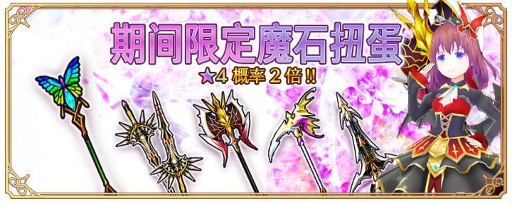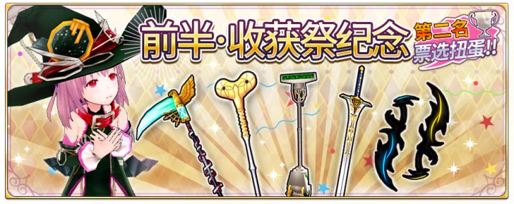 「前半·收获祭票选扭蛋」【开启时间】2019年10月23日 12:00:00 — 2019年10月26日 11:59:59【抽取须知】1、本扭蛋可使用扭蛋券、十连扭蛋券、免费魔石和付费魔石进行抽取;2、本扭蛋每抽取1次可获得1个纯白星砂(水)。※该扭蛋单抽一回获得一个纯白星砂(水),十连抽一回获得十个纯白星砂(水)【★4装备扭蛋概率一览】【票选第二热门★4装备详情】★4武器★