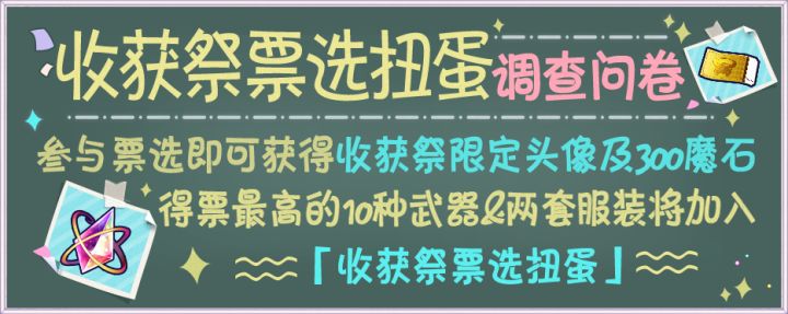 为拉开收获祭庆典活动的帷幕,「收获祭票选扭蛋」调查问卷率先在花冠学园中热烈开展!在调查问卷中获得高票数的★4装备组合,将会加入到后续收获祭庆典期间开启的「收获祭票选扭蛋」中。面对漫天飘下的投票问卷,誓约者们请把握好手中宝贵的选票,选出自己心仪的★4装备组合哦!!活动时间【票选阶段】2019年10月17日 12:00:00 - 2019年10月20日 23:59:59【统计阶段】2019年10
