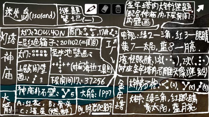 【01】迷失岛-谜题笔记 [使用迷失岛2画板记录](一周目)(二周目)二周目,所有三角块位置标记【02】二周目:金字塔门内,墙壁上.石碑图案-全景实况【03】初始界面.传真机内,剧情概要.全景实况【04】PC版+手机版-全部成就.全景展示(01)PC版-全部成就.全景展示(02)手机版-全部成就.全景展示【05】二周目结尾.开发者展示.全景实况注:胖布丁系列的游戏我都会做一些全