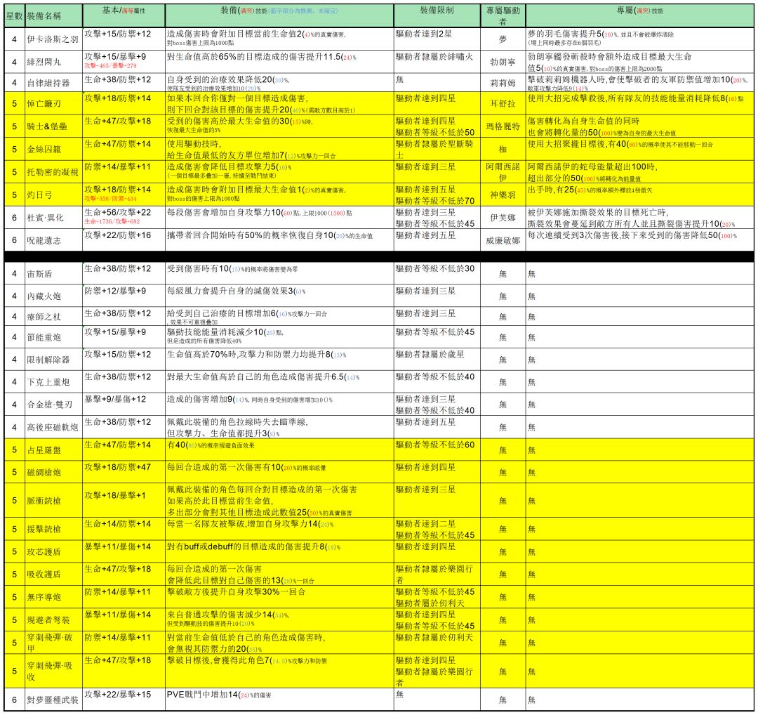 表格数据来源于台服玩家的分享,为了让大家尽快悉知新玩法的内容,我们先转载台服的表格给大家参考。 表格内容可能与国服有所出入,但差距不会很大,作为参考还是可以放心实用的。 文字是繁体字,我们会在未来的几日内于食梦计划wiki上开启新的版块发布简体字的攻略。 武器能力表 专属武器合成表 本帖由【食梦枢纽总局】编辑发布,我们的交流群:631351520 喜欢这篇帖子的话请在下方留个赞~
