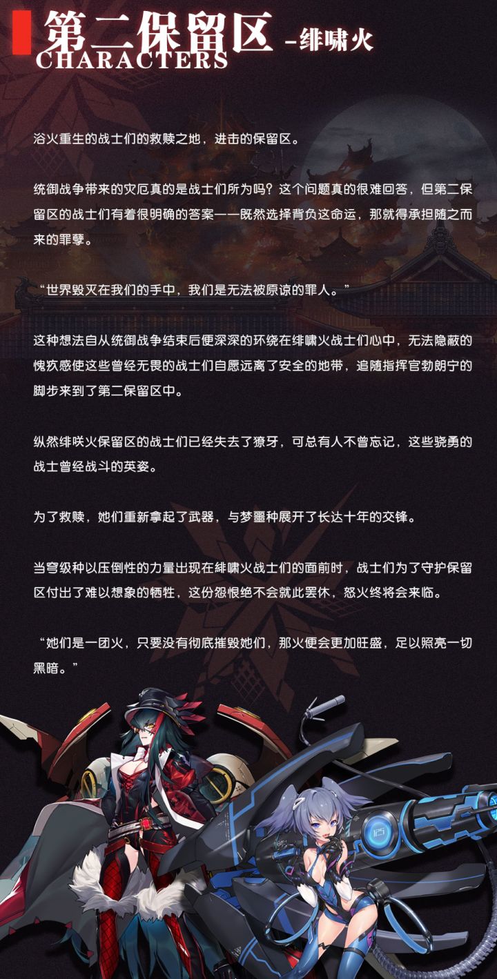 “她们能是一团火,只要没有彻底摧毁她们,那火便会更加旺盛,足以照亮一切黑暗。”----绯啸火-----------【X档案】第二保留区:绯啸火绯啸火,浴火重生的战士救赎之地,进击的保留区。作为统御战争后,人类重建的第二保留区,那里的人们心中背负着无法隐蔽的愧疚和罪恶感。为了救赎,绯啸火的战士重新拿起武器,与梦噩种开展长达十年的战争......--------【彩蛋入口】加入食梦玩家群