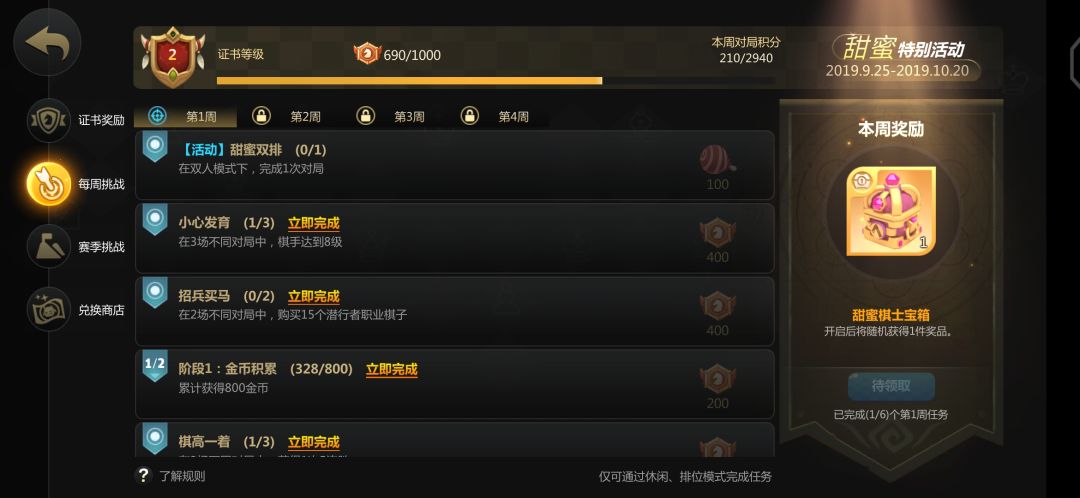9月25日00:00体验服更新了证书甜蜜特别活动 高阶证书需要300甜甜圈,高阶证书+对局经验提高50%+直接升10级需要680甜甜圈,楼楼只有380甜甜圈,所以只买了一个普通高阶证书 证书一共60级,任务分4周进行 ①1级奖励 棋手——悟空妹体验卡(14天) ②10级奖励 棋手——水晶龙体验卡(14天) ③20级奖励 棋盘——峨峰真境体验卡(14天) ④30级奖励 头像框——破碎剑刃(永久) ⑤
