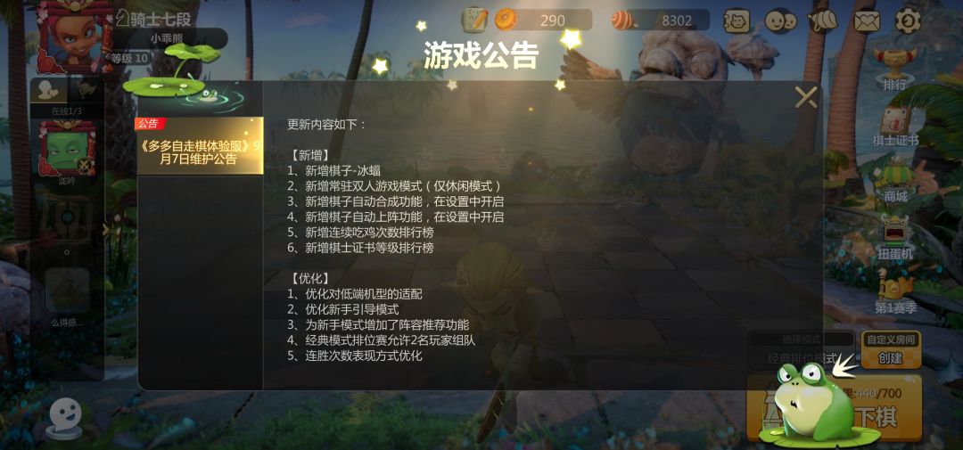 此次体验服更新改动还是挺大的 总结一下(包括更新公告的言外之意、暗改等):开放双人排位模式,目前测试骑士士兵段位相差10段可以一起排;梦境模式甜蜜双排常驻,并且有独立于单人排位的甜蜜双排段位;新增1费棋子职业法师种族龙——冰蝠;棋子商店新增一键合成按钮;即将开放充值系统,部分商城物品改成甜甜圈购买,新增甜甜圈购买的地图、棋手等;原糖果抽奖池中橙色棋盘、棋手移除,其中部分移入甜甜圈抽奖池,并且新增部