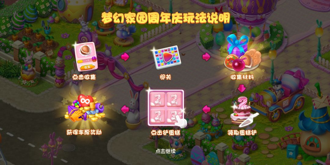 大家好!我是秃击队的幸福生活,非常高兴的一件事到来了,梦幻家园迎来了2周年大活动,也是大家非常期待非常快乐的一件事,那么今天我给大家说一下周年庆玩法,有好多朋友搞不明白怎么回事。 温馨提示:此玩法仅限安卓用户。 简单说一下流程,玩支线关卡收集所需的目标,每四个是一组,需要收集四组,每四组完成就会四个蛋糕铲,切蛋糕获得道具。 每次闯关就会有这个大转盘,这里面有两个是大奖,也是大家最希望转到的奖励,可