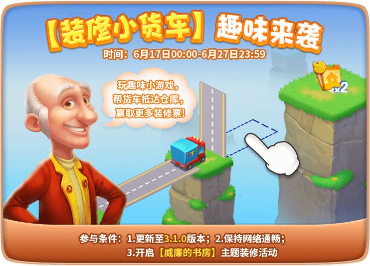 新的小游戏上线咯! 一次装修活动,两种获得装修票的方式,好好玩啊ᐠ( ᐢᗜᐢ )ᐟ 6月17日-27日,人人都有小货车~ 🏁始发站:「威廉的书房」装修活动 🚩终点站:山那边的家具仓库 ( ᵒ ૩ᵕ )行车不规范⚠全村去吃饭o(T^T)o !! 出行安全手册 !! ①出行须知: 长按屏幕延伸高架桥,目测距离差不多了松开,让小货车顺利开到目的地家具仓库。如果能正好落到中心发光点,可以额外获得一张装修票