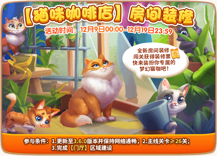 时针转动,眼看着马上就要启程去神庙了 奥斯汀为大家准备了一些大礼,来应对探险时的突发危机 快来和奥斯汀一起来看看吧 【猫咪咖啡店】 活动时间:12月9日-12月19日 可爱猫猫组团来袭,猫咖装修,大家都久等啦~ 就在明天,快来装扮你的专属猫咖吧,让这些猫猫全都暖暖过冬 【倒计时签到】 活动时间:12月8日~12月12日 听说神庙的探险困难重重,小主人一定要做好充分的准备哦! 贴心的秃秃给小主人带来
