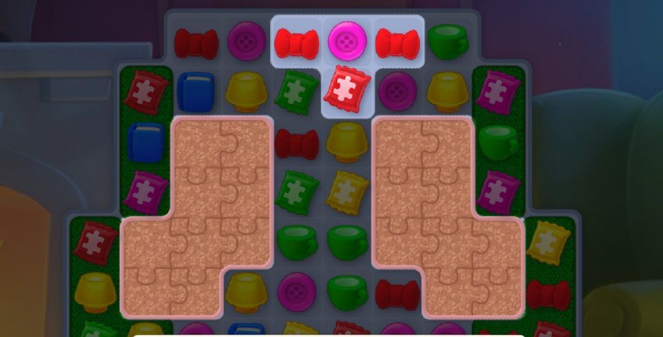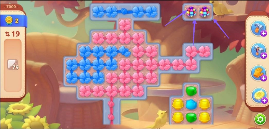 第7000关攻略 【障碍物】蝴蝶结,花坛 【通关要求】79个瓷砖 【步数】19步 【难度系数】普通难度关卡 【游戏攻略】 本局一共分3个部分,3个部分上下相通,收集完当前部分所有的目标物才能进入下一个部分。本局步数较少,但是局内也有福利道具,只要合理利用,过关没问题。 开局第一部分,障碍物是蝴蝶结,在右上角有2个彩球,只要走一步,联动激活就能消除蝴蝶结,同时收集右下角的目标物。 接下来,观察局内元