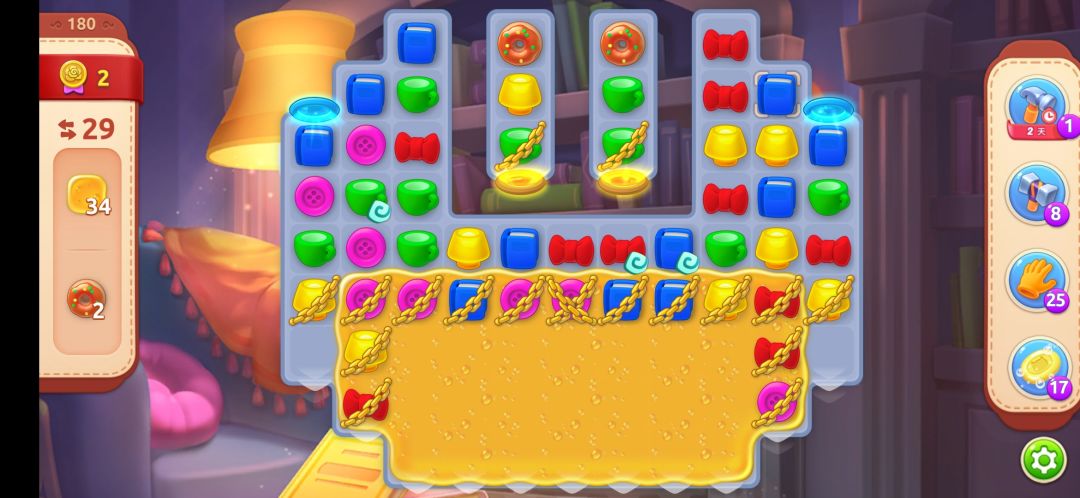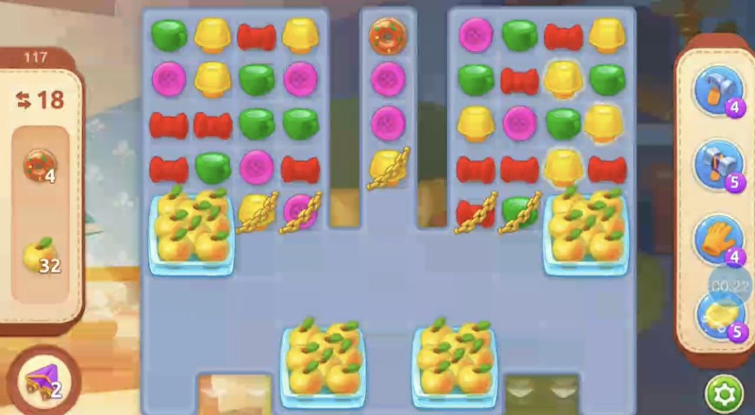 【关卡介绍】 关卡目标: 甜甜圈x4, 苹果x32 关卡步数:18步 关卡特殊元素: 铁链(可消除) 关卡难度:一般难度 【关卡攻略】 通过图片,可发现本关被铁链分割为上下两部分,首要任务是消除铁链让元素可以掉落到下半部分,至于铁链可以通过道具或者匹配相同元素消除它,还有一点要注意到是:甜甜圈只有掉落到最下面才能收集,一页面只会同时出现两个甜甜圈,要尽快收集前两个甜圈圈才有步数解决后面两个。 首
