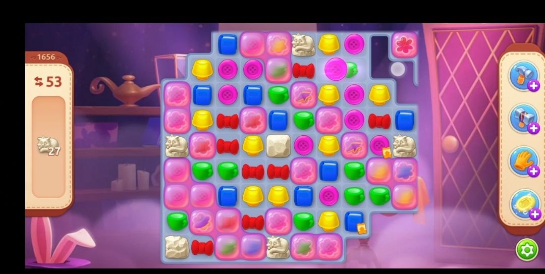 关卡目标:猫咪石像27 关卡难度:一般关卡 关卡步数:53 关卡障碍物: 攻略截图果冻 本关是三场景关卡。 第一场景可以看出,果冻下面有炸弹等加速道具,所以首先利用匹配图块来消除障碍物果冻,猫咪石像匹配图块是不能收集它的,只能用加速道具炸开才可以,如图所示,有些猫咪石像还是石像状态,需要炸开一次,呈现出猫咪的形态,第二炸开才能收集 现在我们来到第二场景关卡,观察一下可以看出,和第一场景关卡类似,还