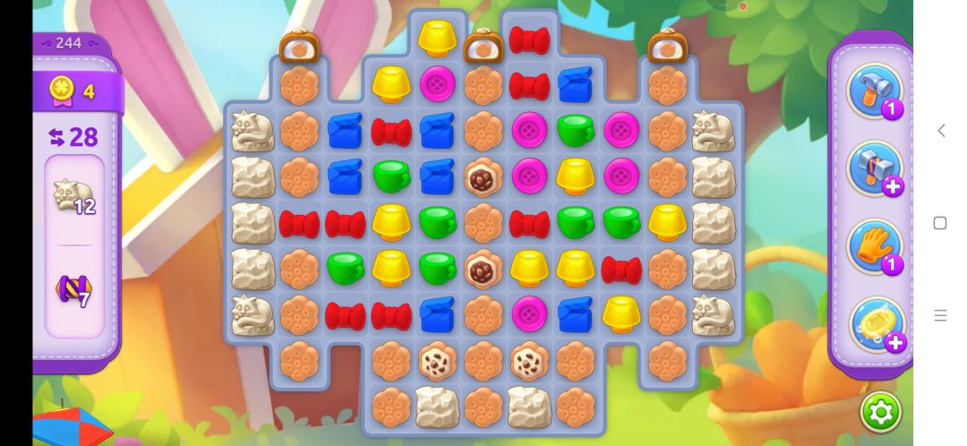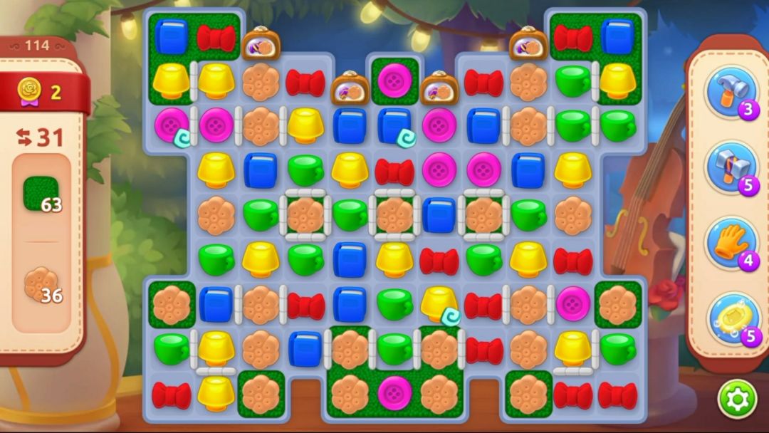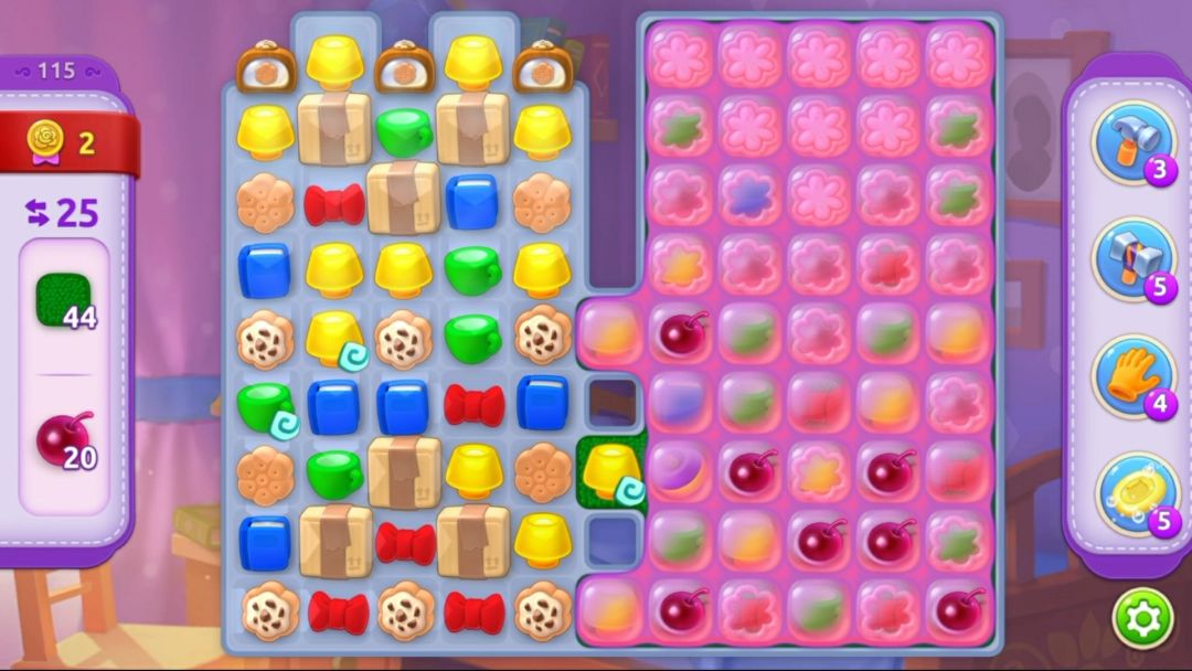 【关卡介绍】 关卡目标:地毯×44,果冻×20 关卡步数:25步 关卡障碍物: 箱子,饼干 关卡难度:高难度 地毯:在地毯上匹配元素才能给周围没有地毯的地方铺上地毯,或者道具经过地毯后的地方也会铺上地毯! 饼干:饼干会阻挡地毯的铺盖,需清除饼干后才能铺上地毯,饼干还会阻挡道具的前进路线,比如火箭遇到饼干,那么饼干后面的地方火箭就无法到达了。 果冻:可以看到果冻或下面元素的需要在其旁边匹配一次(或用