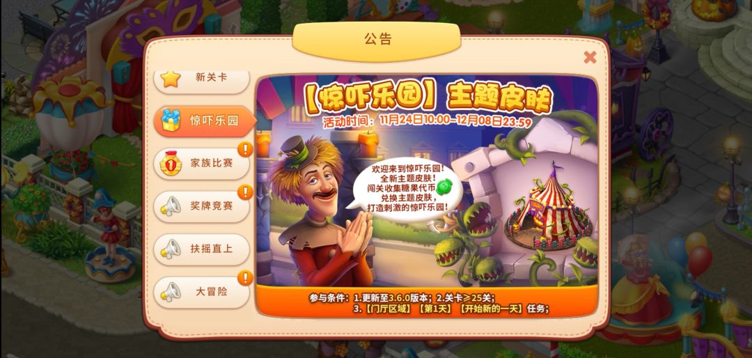 嘿,快用灵异装饰物装扮花园,准备迎接万圣节!! 活动公告 活动时间 ❶11月24日10:00~12月08日23:59; 参与条件 ❶版本更新至3.6.0; ❷主线关卡≥25;且完成【门厅区域】【第1天】【开始新的一天】任务。 游戏界面左边箭头所指的南瓜🎃图标,点击就能查看万圣节所需要换的全部装饰物,此次皮肤收集的元素是糖果🍬。准备好糖果,不给糖就捣蛋👻!! 这次皮肤一共需要36350个糖果🍬,通