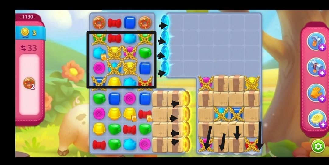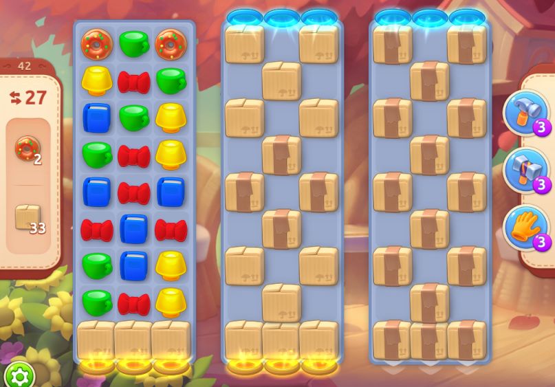 目标:收集2个甜甜圈 目标:收集33个纸箱 步数:27 甜甜圈收集方式:通过消除甜甜圈下方的棋子,让甜甜圈移动到带有下落标记的收集点 纸箱手机方式:在纸箱旁边做消除,飞机、火箭等效也可以收集纸箱 注意事项: 最右侧纸箱为双层纸箱,需要消除2次才可收集 左侧纸箱消除后,中间和右侧纸箱需要用特效消除打开局面 本关步数相比收集目标数量较少,谨慎操作 本关小窍门: 在左边多做火箭特效,横向打开中间和右侧消