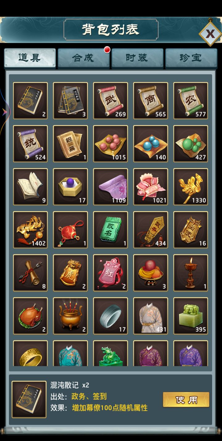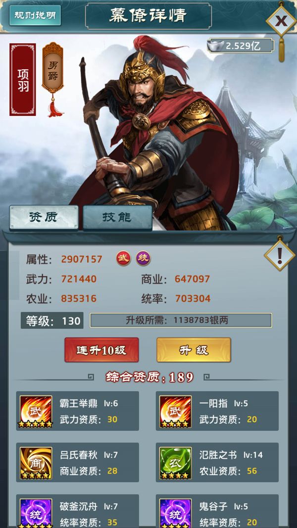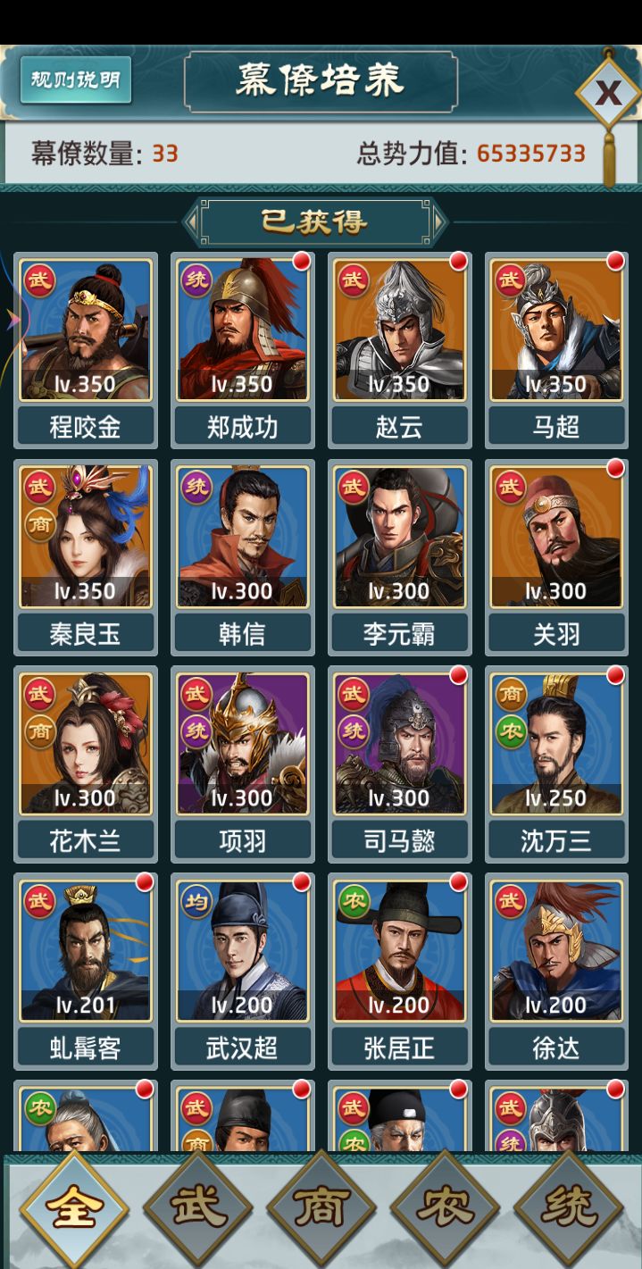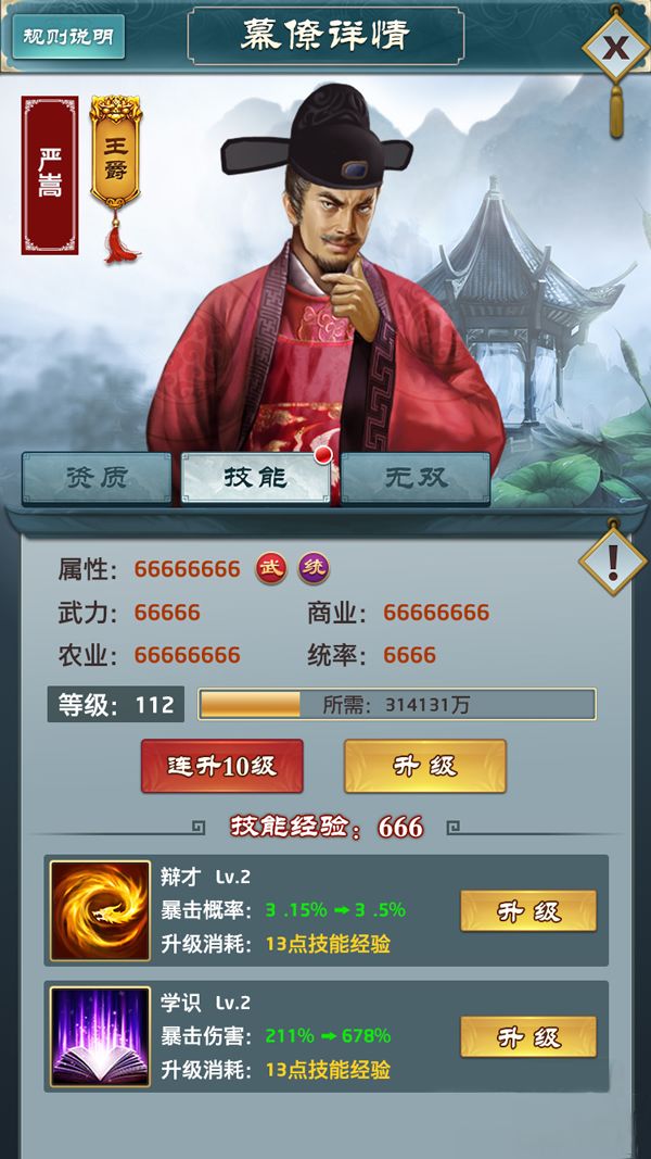 一、游戏属性为武力、商业、农业、统率,四项属性的综合加起来就是玩家的势力值,这些属性主要通过强化幕僚来增加,商业影响每次征收到的钱财数额,农业影响收到的粮食,统率影响招兵人数,武力影响你过关卡以及PK以及打远征的数值二、四个属性中最重要的是武力,因为在攻打关卡时你的武力值越高,损失的兵力就越少,所以前期新人们不用急着打关卡,先把武力强化上去再打不迟三、幕僚游戏里目前幕僚不需要你招揽,每当你完