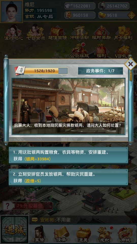 大明王爷由上海芒果互娱科技有限公司发行,是一款以明朝盛世为背景打造的宫廷养成类手游,发展势力、迎娶妻妾、生儿育女等玩法,带你体会由权力与情欲带来的无尽快感。下面小编就给各位带来了大明王爷手游玩法攻略介绍,一起去看看吧。为了解锁更多的玩法,升官成了玩家游戏里最关心的目标之一,虽然这是一个需要耐心积累的过程,但只要有方法也是能快人一步升官发财的~今天小编就来和大家讲解一下《大明王爷》如何积累政绩,提
