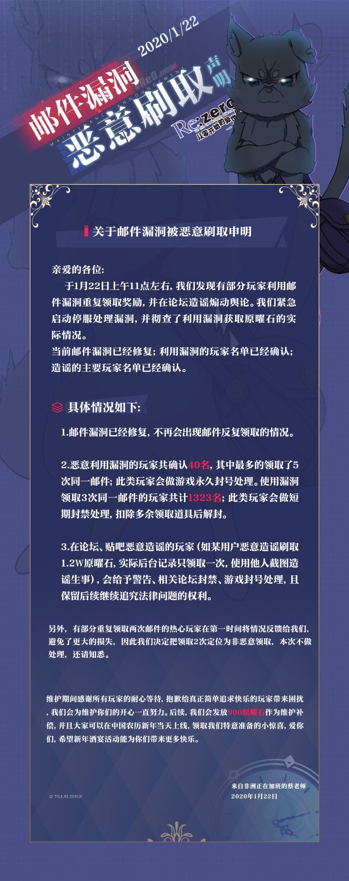 1月14日公测论坛抽奖活动中奖名单:原帖链接:随机抽奖公示:奖品详细:1. 爱蜜莉雅手办*12. 定制福袋(三张动漫角色剪纸+2020年台历+PVC手提袋+许愿卡一套)*53. 定制春联*5各位玩家大大,十分抱歉。本活动原计划公布中奖名单日期因春节假期及特殊情况推迟至今,并且因特殊原因兔子们大部分仍然在家远程办公中,所以奖品发货可能略有延迟,还请玩家大大们能够理解丫~!请中奖玩家
