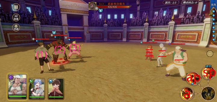 作者:怠惰司教 写在前面的介绍汉字一二三是我方的顺序数字(1)(2)(3)是对面的顺序a是一技能,ap是二技能,sp是三技能一a(1)就是我方一号位用一技能打对面的(1)号位1基础篇评语:很简单,如其名所说是基础中的基础,同时也有新手引导,需要一定的智商才会过不去。1-1一a;三ap1-2一sp;三sp1-3一sp;三大1-4一a;二sp;三ap(这里要按慢一点,等