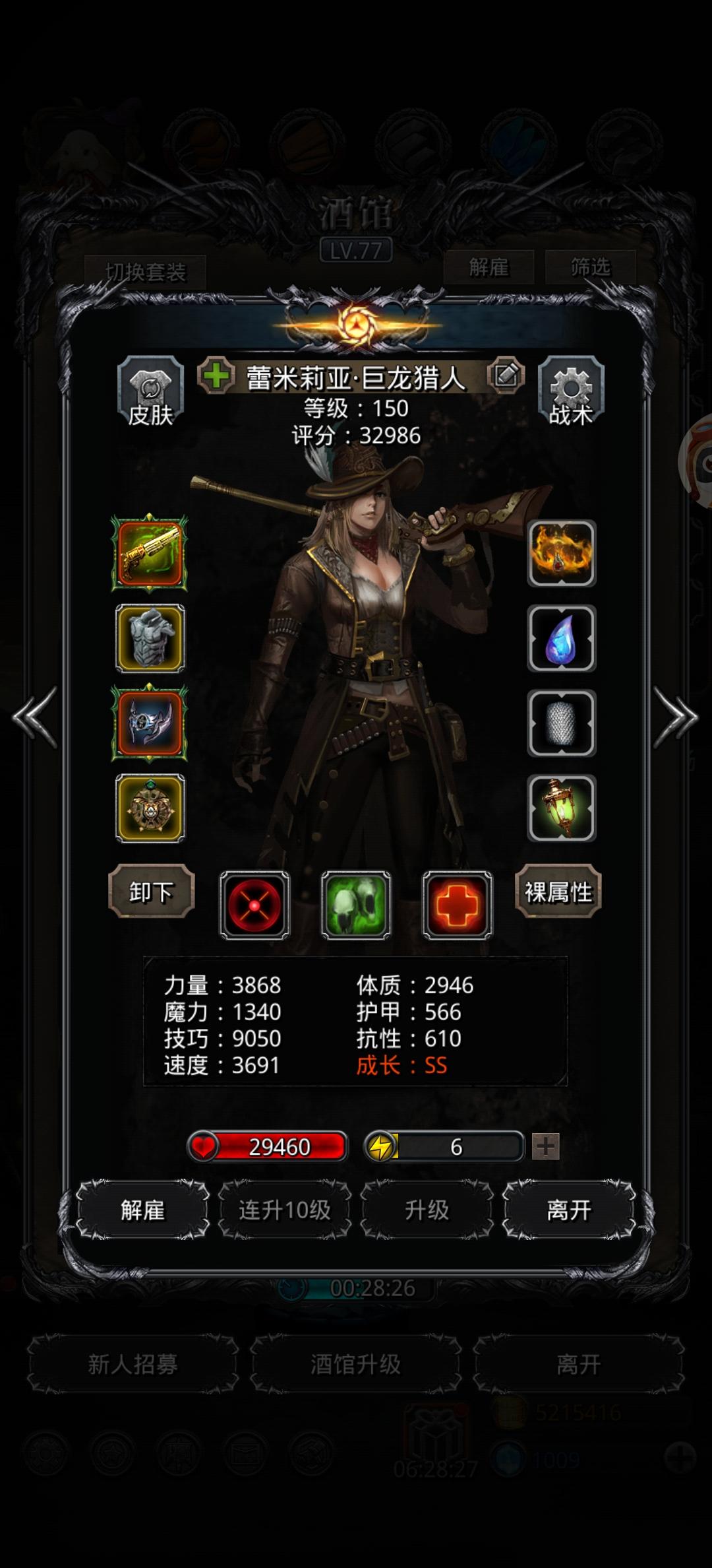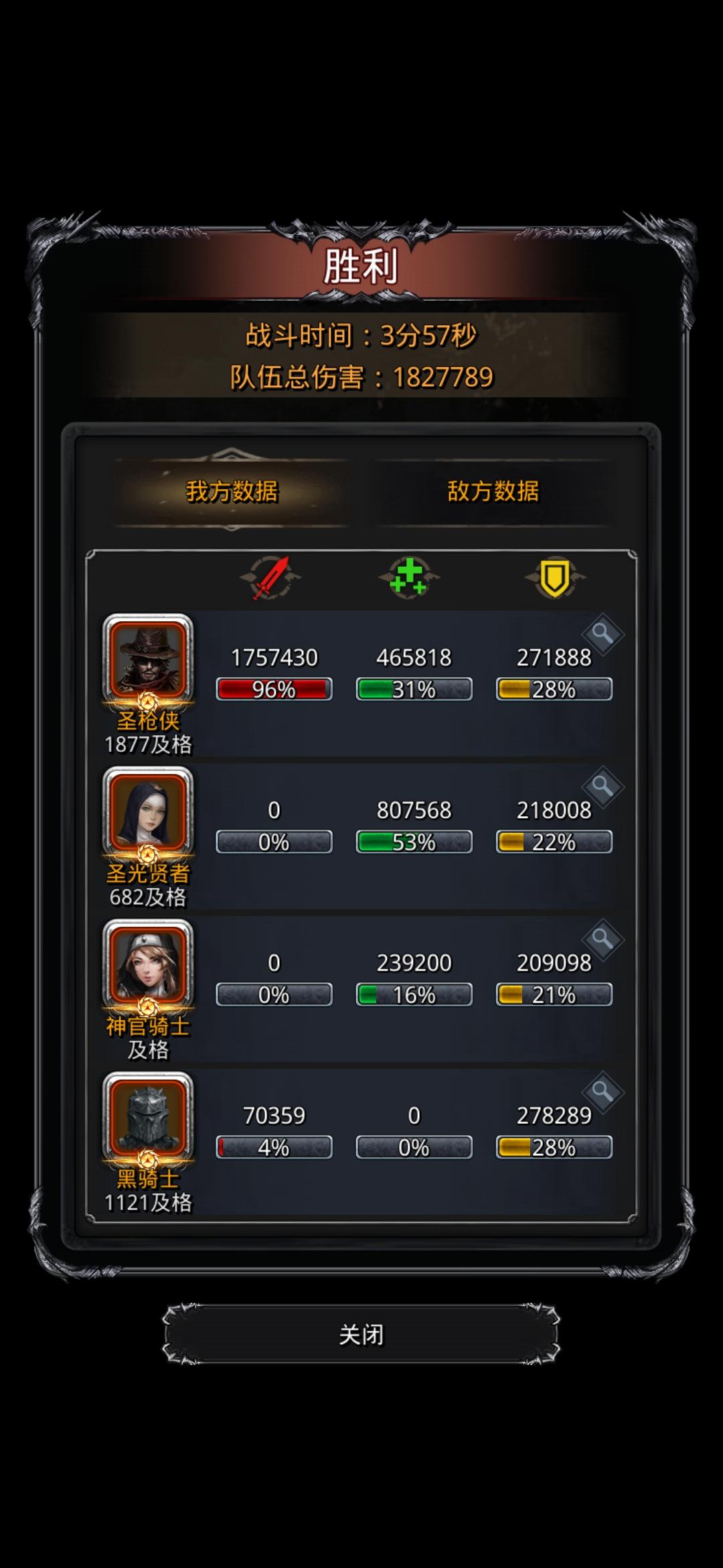 配装大同小异自行参考wiki或者taptap上的攻略(感谢大佬们),这里只说翻到爽后把所有帖子全翻看完后得到的所有细节: 1、黑骑一定要控制力速比满足嘲讽3.7秒、虚弱斩击4.4秒,然后始终嘲讽开斩击,开自动后无需手操黑骑大幅减少因手操产生的失误 2、巫医设置始终奶自己带先发,开局自动奶自己一口之后手动轮流奶,之后每次轮到奶自己都开自动 3、如果像我一样属性过低(没造大贤者板甲)准备刷脸的话,可以