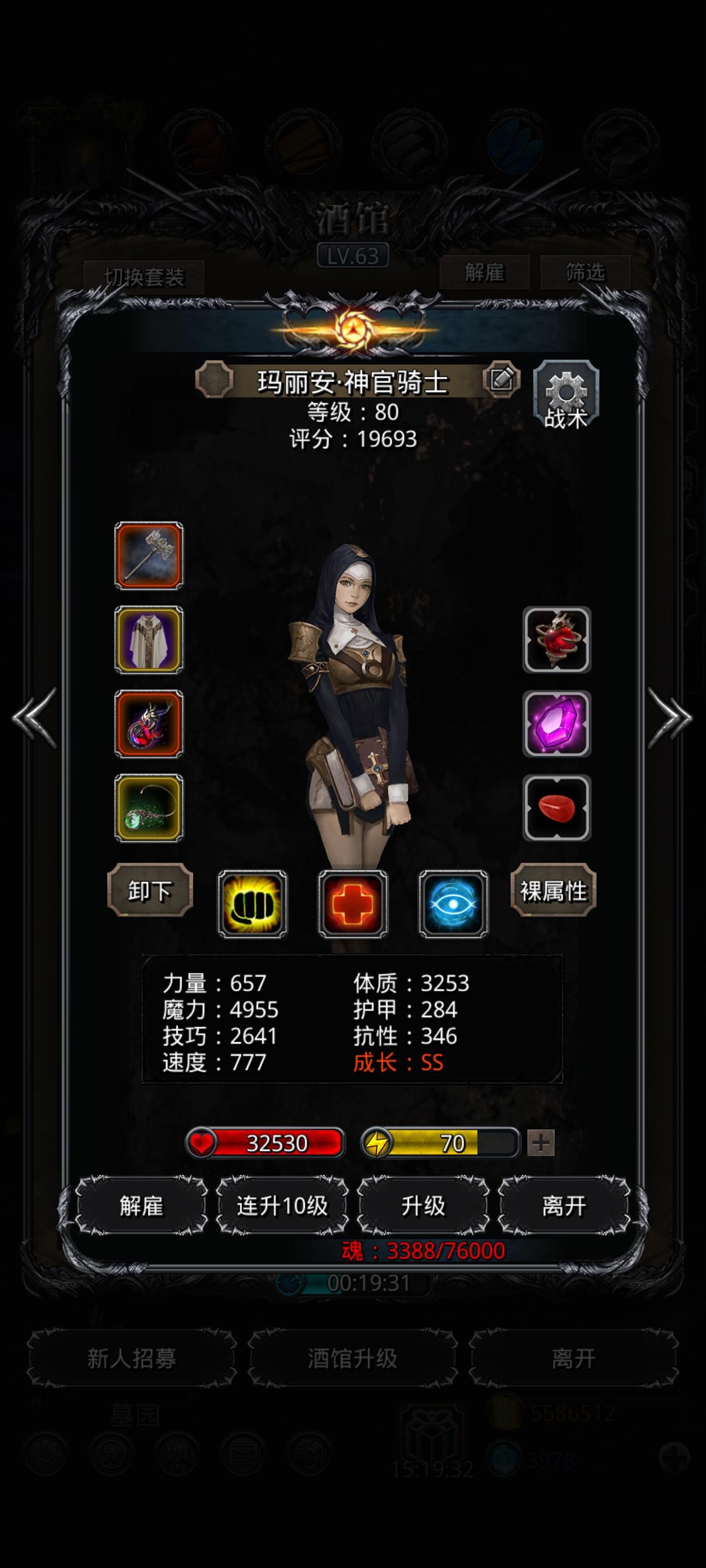 85锻了都,这个还过不了,今天打了10次,心态爆炸了,真的没有乐趣,全是受罪呀![表情_羞涩] 圣骑在毒师和祭祀死前不能断嘲讽,否则别的角色中两下一定会挂,就是说真的非…… 前8次都一直在试…… 倒数第2次用上面的阵容打的时候大概是一个小怪打一分多几秒,小怪打完好像4分多钟,忘记给圣殿压血了,所以法师第二个挂了,圣殿和祭祀伤害倒是不低,就是疯狂miss,这当然也很正常。 最后一次是第9次打完之后忘