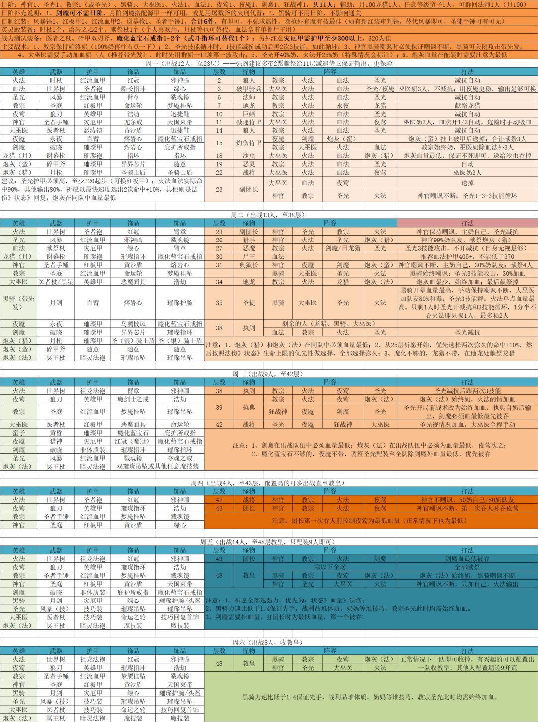 血量:火法>圣殿>圣光>圣枪。(让boss先吃圣枪) 全体防火防减速,圣殿防流血瘟疫,时锤(必需),时杖,时枪,熔岩之心。 火法:4人群攻,单攻,40/40奶。战利品命中暴击魔力。 圣枪:5人群攻,开射击。战利品命中技巧。 圣殿:50/1奶,始终嘲讽,不开攻击;开出嘲讽后改成100/1奶,手动续嘲讽;小怪死完关奶开攻击。战利品命中暴击魔力 圣光:始终奶队友,始终群攻;小怪死完关奶。战利品技巧先发。