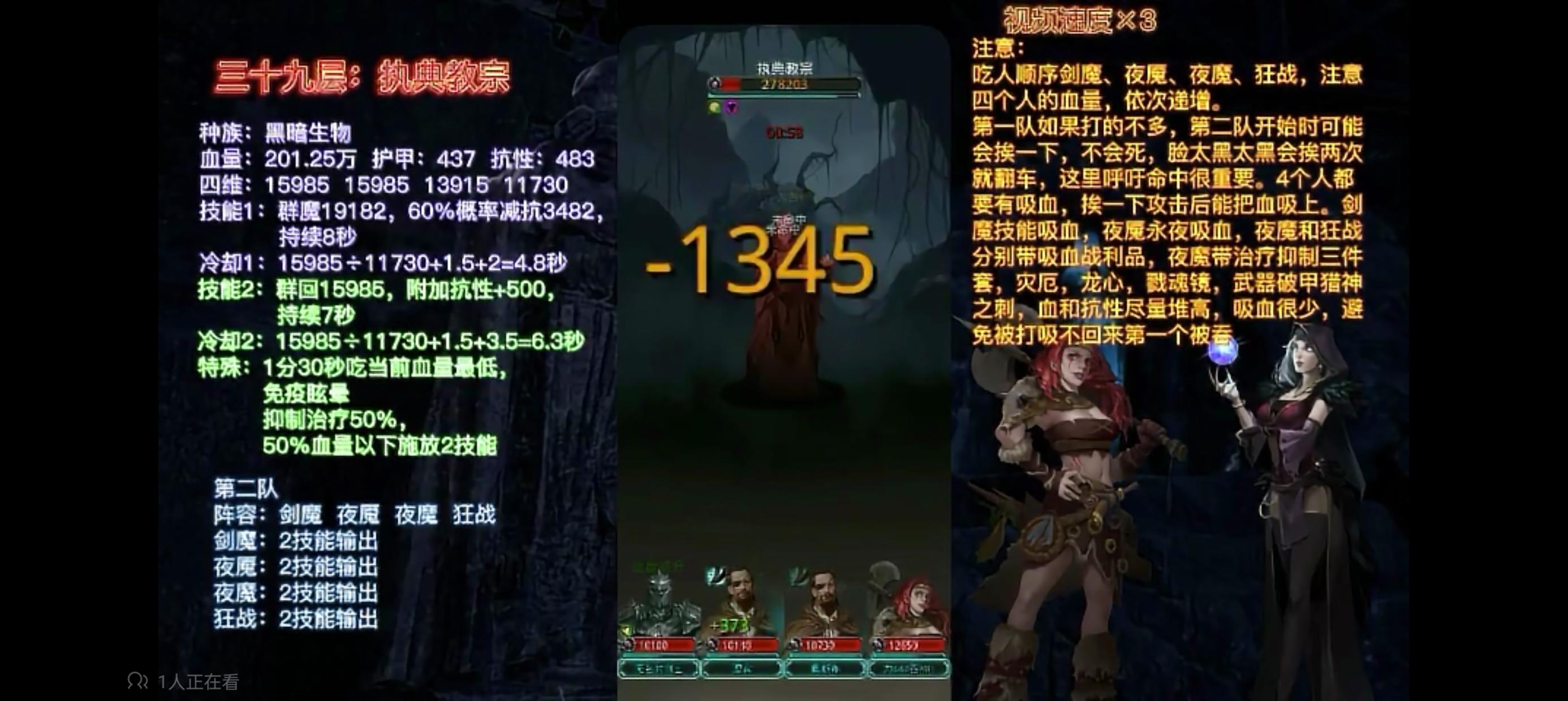 39执典基本要用两队,一队磨到boss自奶,另一队纯物理队收掉,因为boss后期加抗500,魔队没法打。 如果不幸第一队配置不当打了没多少就团灭了,最好上一队教宗领队的物理队平推。 带上红审判+灾厄铠+戮魂镜抑制后奶量如图2,有火刑上火刑,替掉狂战,必备猎神刺,另一个当然是攻略里推荐被最先吃掉的剑魔。 火刑挂了,刺客也没必要再输出了;刺客挂了,火刑会输出的很慢,过了s+应该是可以三分钟之内打完的。