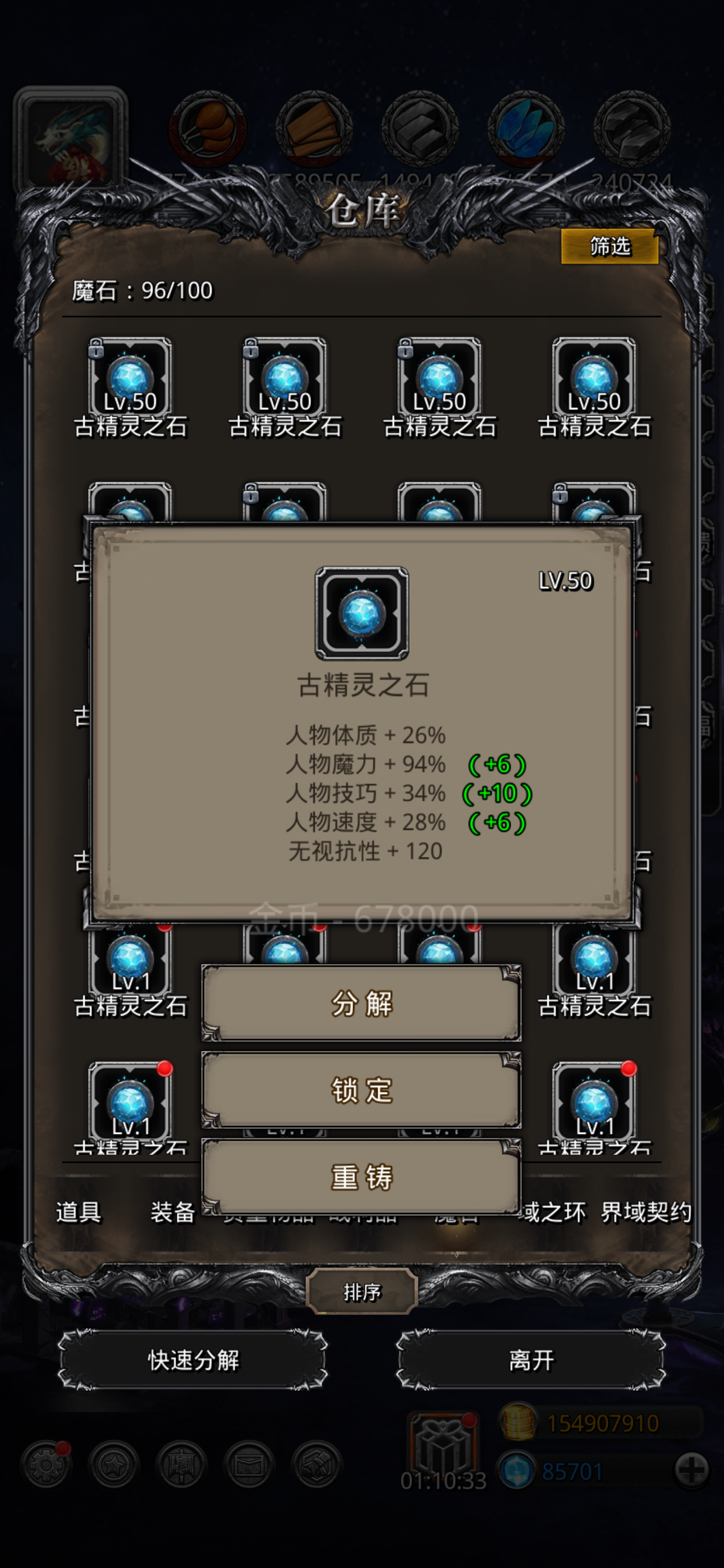 3 个角色都是及格线,传猎未达及格线,除祭司 66 其他圣迹均为 80 魔石有两个是石窟的保底 +80,均为无视 150,这个比较重要,血法无视不够吸不回来,除非带+10 吸,传猎魔石+77 力+40 体(体力非常极限,但是抗住一击线一般不会暴毙) 战利品:传猎+20 吸,血法+25 纯魔,蛮子无吸、+27 力、+6.8 暴击,+3 体(蛮子体力卡的比较极限) 锻造 105, 卡了我 2 周,双月