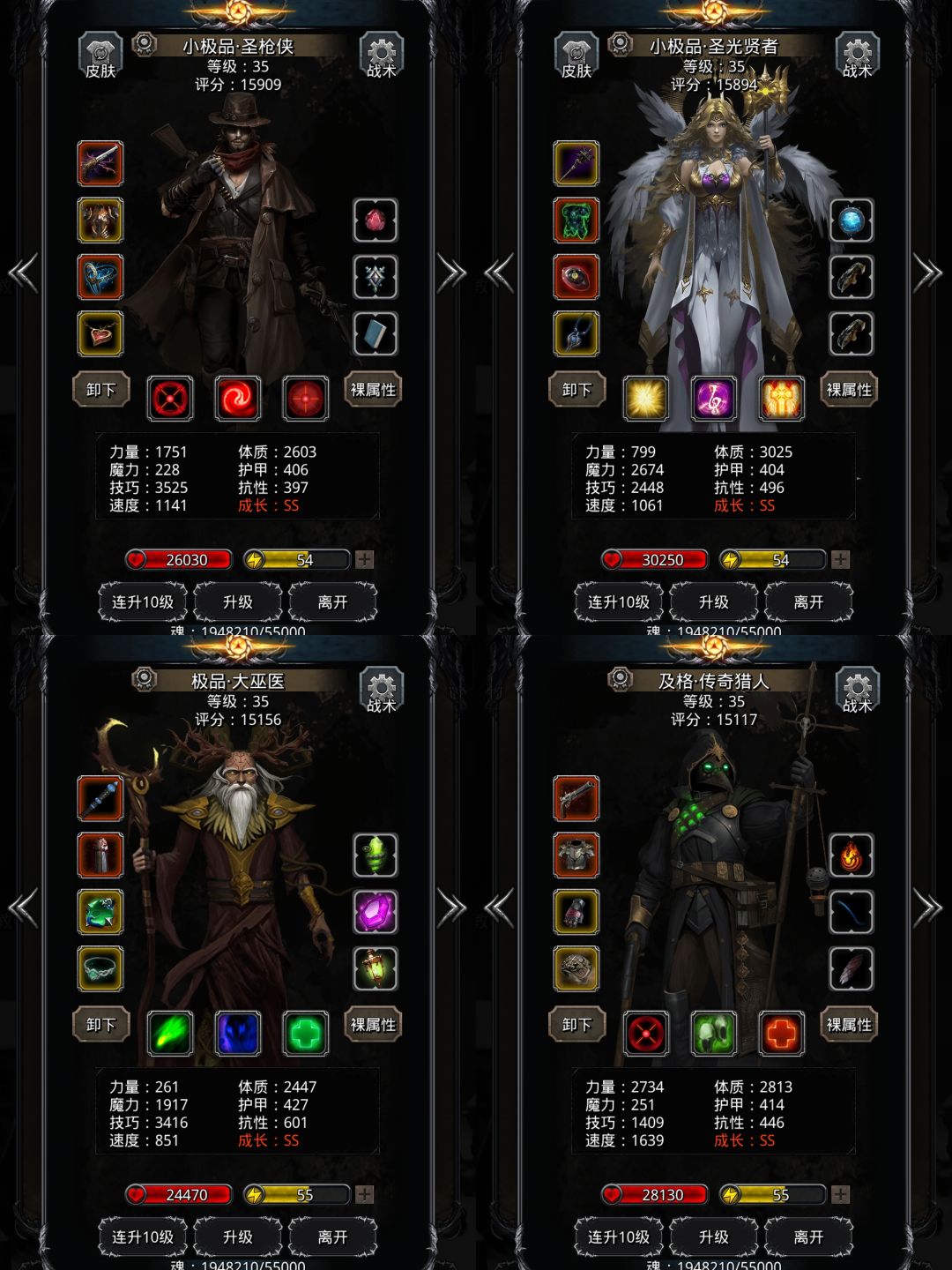 配装大体就这样了,换来换去也差不多 技能设置:巫医神官100奶队友,开局神官手动奶巫医一次,圣龙嘲讽反击手动盾击刷流血甲被动 细节:1.巫医体质越低越好,以便神官一次可以奶满巫医,理论上有2000体加神官buff就可以存活,所以盾用巧手符文,不要用恶魔剑士符文; 2.由于这个等级和装备导致巫医体质再低也低不到哪去,所以后期发现神官一次奶不满巫医后,可以适当调低奶线,我从100——95——90——8