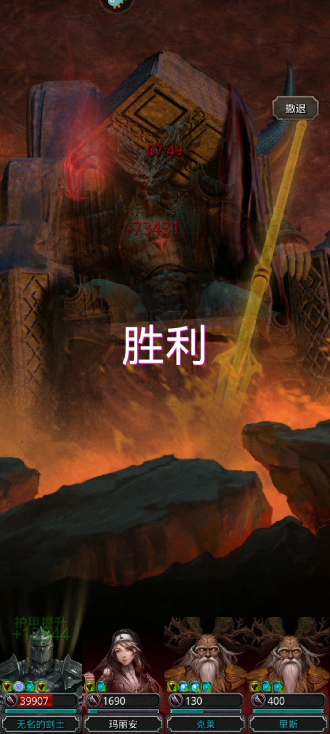 7分43秒拿下魔将,纯卡属性的boss,属性达标了也就过了。站位:从左至右神官-传法-虚空-黑骑。操作简单,神官始终奶黑骑。