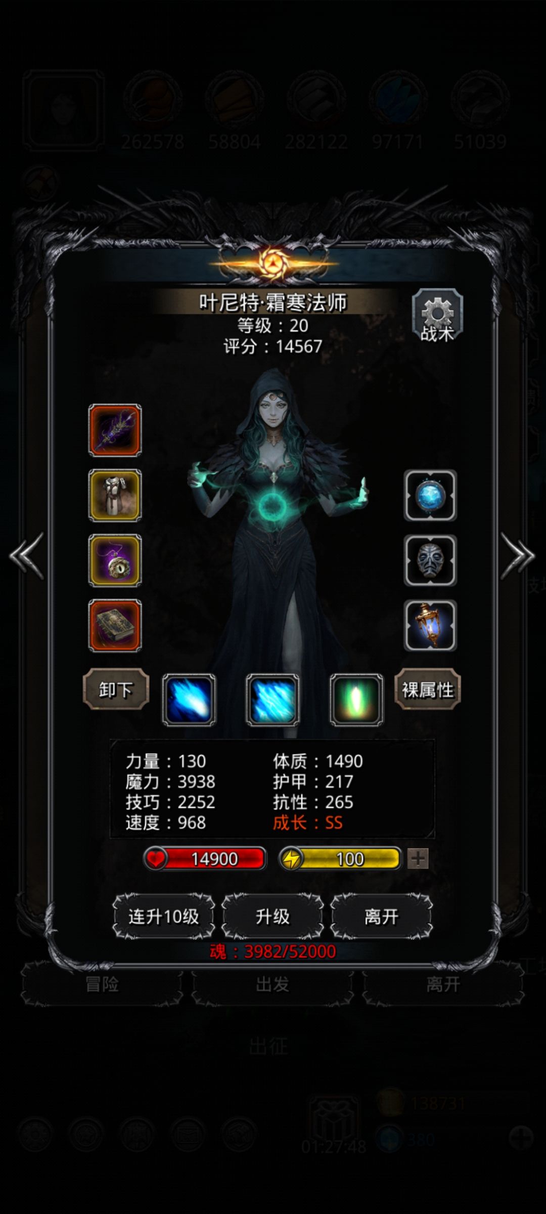 毫无套路可言,就是朴实无华的把属性摆在那边,要么铁多装备锤到90%,要么柱子老老实实升100…哎,祭祀柱子100的话属性刚好够…又开始咸鱼了 万万没想到,咸鱼了一天而已,把神官的云铠锤到了抗性最低,但是其他属性90%左右,唉!居然抗下一次aoe还剩120点血,大喜! 接着打了十来把手动操控神官的套路,发现总是会猝死一个,可能因为延迟关系,加血总来不及!于是我改成手动51,结果两把就过了,一把漏嘲讽