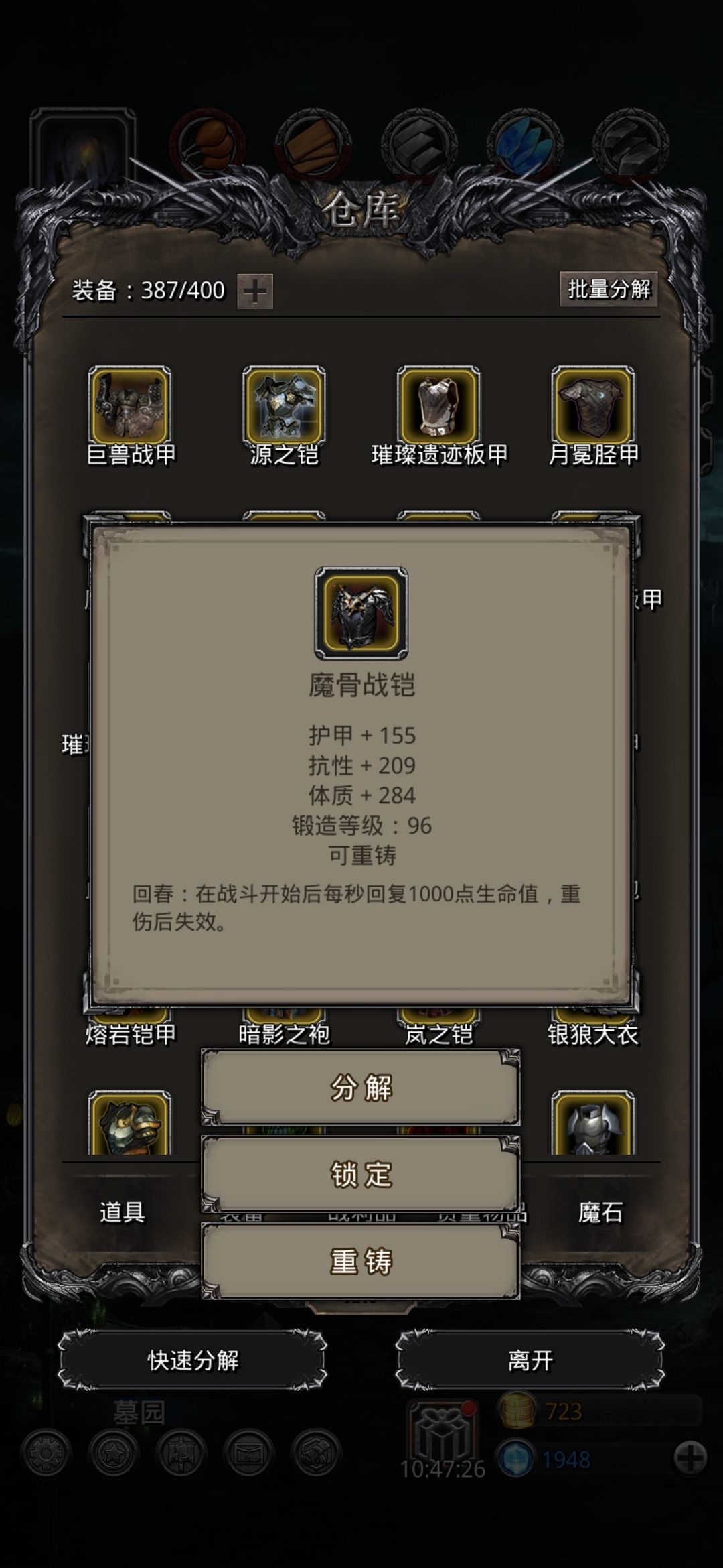 离打完恶魔门才过了6天就又攻克了一字马的一员大将托雷佐[表情_斜眼笑],一字马儿你就洗干净脖子等着我来斩杀你吧 昨天还犹犹豫豫的不想再氪一张卷轴了,但是看到目前的状况没半个月凑不齐所需的英雄等级,以及装备没那么多铁去重铸,只能咬咬牙氪了一张卷轴,把剑魔,圣龙,巫医全部拉满,不得不说这破卷轴给的东西是真少,一番操作下来全用空了,包括重铸装备的3000万铁 不过换来的是今天一口气,裂隙77,恶魔老者,