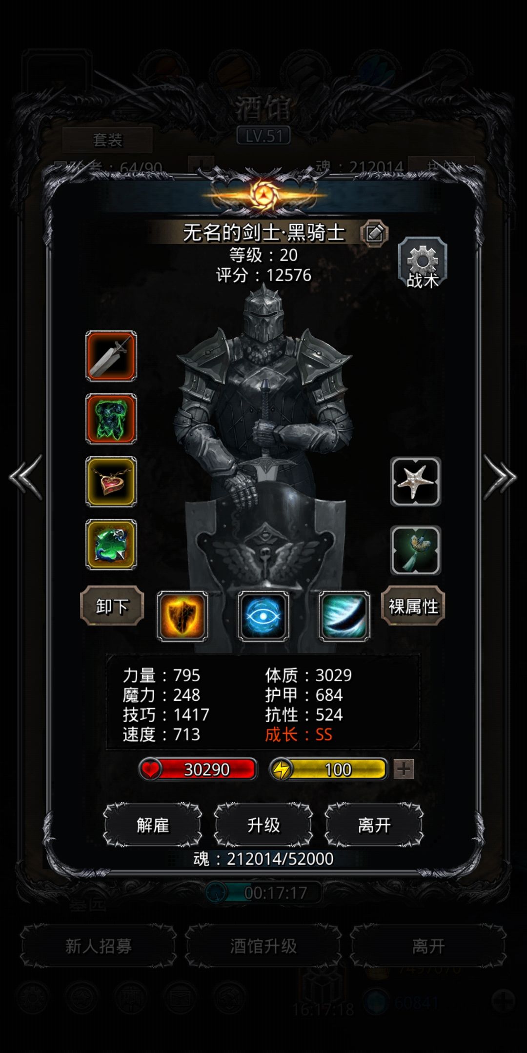 调装好多次,经验总结: 1、黑骑血量很重要,务必过3w,护甲稍微低一点都没关系,可以靠调整神官的装备补回来。只要4分15秒之后没有被单攻秒,巫医回血能回上来。我的黑骑承受单攻的总护甲是1917(自身护甲+嘲讽+神官加甲) 2、巫医护甲最好能接近500,血1.7w以上,这样能保证4分15秒之后不被群攻秒。 3、输出的总护甲(自身+神官加甲)能到700以上,血1.2w以上时可以抗住4分15秒后的群攻。