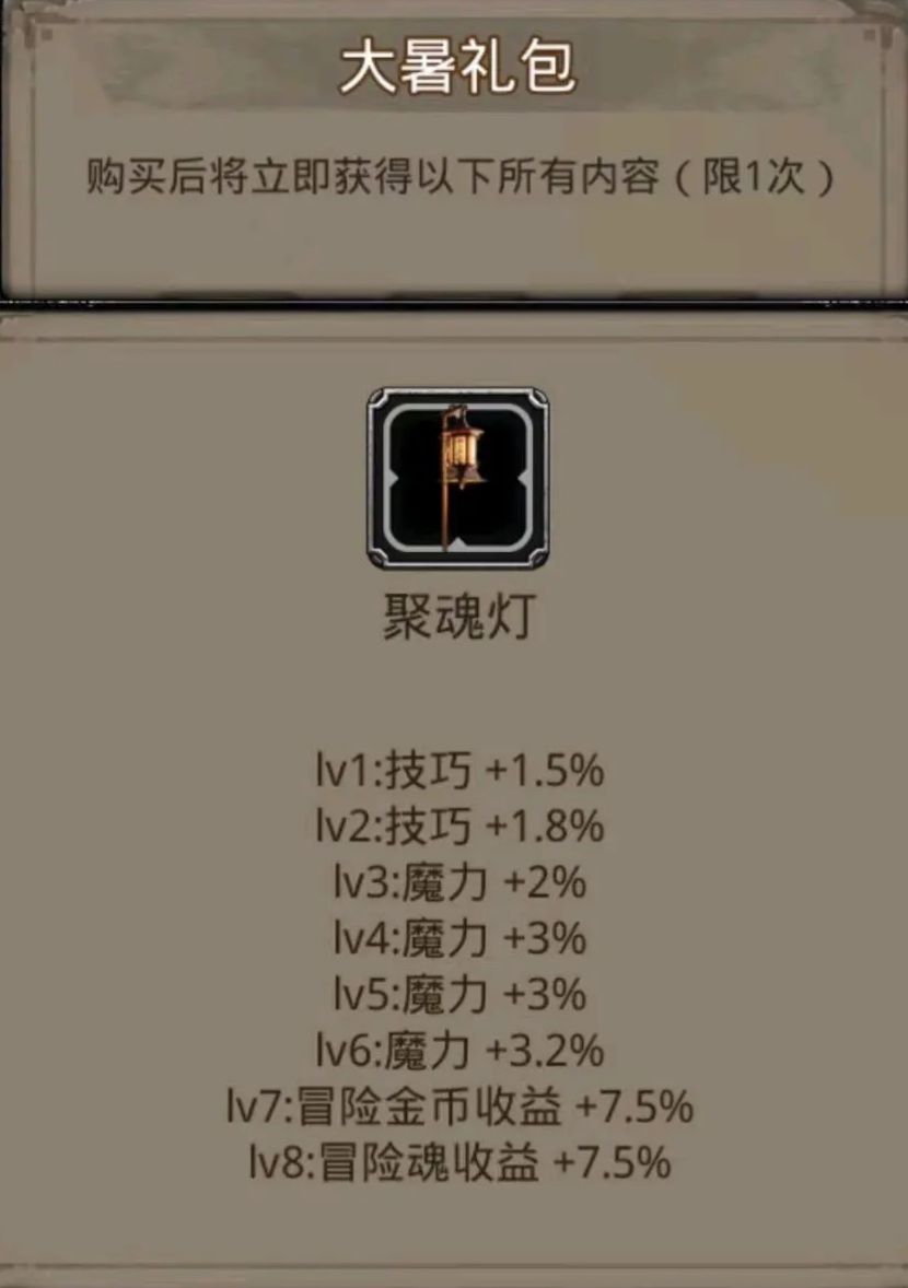 先说结论:不建议!!氪佬除外。 以前198礼包战利品基本都是一个输出系大极品,一个辅助功能性(大)极品,一个适用性不高的添头(双冒险),这次的礼包多多少少有些差强人意了,性价比太低,不像是198的水平。 先说说这个聚魂灯吧,魔力其实挺高的,技巧作为副属性占比数值也还不错,如果是自升战利品,那么这就是神,何况还有双冒险,属于无法自升出来的类型。 但很可惜,这是198氪金战利品,而且副属性不是命中也不