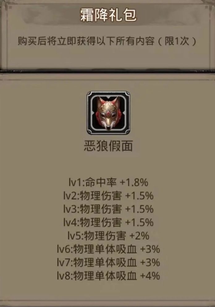 老规矩,先说结论—— 中规中矩,没有特别拉垮,也没有特别惊艳,这种情况买不买纯粹看个人了。 注:中规中矩只是相对于氪金战利品礼包而言,对绝大多数的非氪金战利品依旧是属于降维打击。 下面附上具体分析: 恶狼假面: 本身是很强的属性,物伤带命中,无论是给剑豪还是狂战都非常好用,尤其是给夜魇,提升非常明显,在让夜魇拥有单吸的情况下又不会降低太多输出。 目前单吸战利品的话,狂战剑豪的战利品出得还是比较多的