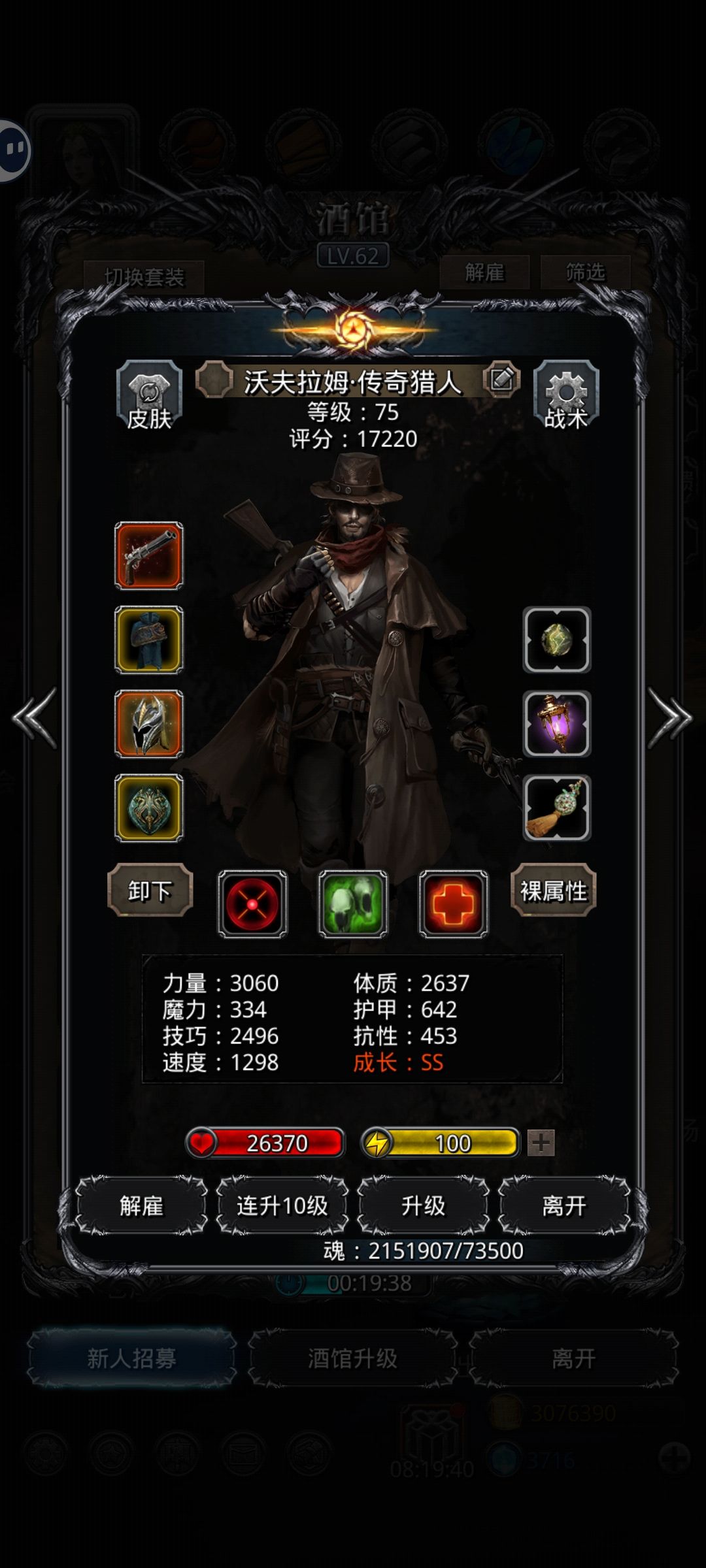 卡了两周多终于过了,发出来给还卡着的朋友们做个参考。我是五柱80过的,蛮子81,法师82,奶妈84,枪80,其实枪74的时候就能过了,奈何蛮子这个笑出声一直演我,起码三十把,没五柱80前,按这个属性(枪手加了六级柱子,人物加了5级等级)后面基本都是差10-60万左右,后面受不了了,分了几个自升魔石换了金币秒了枪手圣迹到80四把就过了,蛮子四分四十秒多的时候又暴毙了,还好传猎最后出了几下特效打过了。