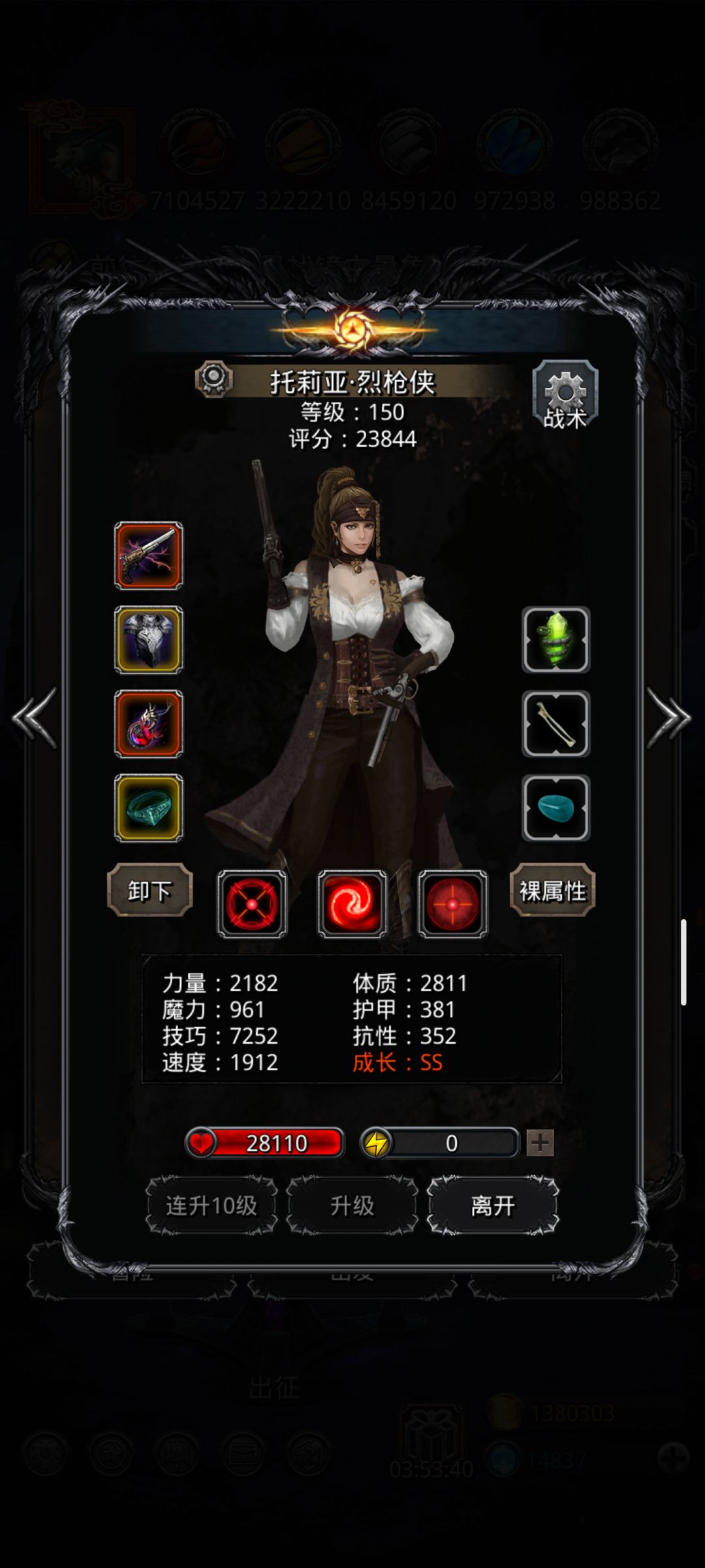终于筹齐技巧了。主要输出还得是夜莺。 技巧配置看图,减技18000,诡术攻击的技巧得要27000以上。 无操作细节,传法奶一直奶。(用咒火杖,打一下扣了14000的血,打不过的,不过诡术的饰品配的圣冠。可能是80的技巧不够了) 圣迹,枪97,刺客87。 坚碑50,先打打支线任务,拿石头。