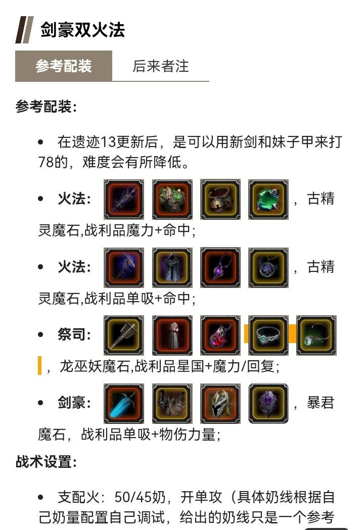 主贴: 裂隙103 神官:叠技巧,多人体技土环(物理减免大于500的普通环也行,保证队友护甲前提下能活不到2分钟即可)免疫眩晕,只嘲讽,嘲讽后护甲全队最低。 火法双单吸,圣枪剑豪单吸物伤,0力速。 裂隙104 圣枪叠技巧,单吸可带可不带。 传法叠技巧,巧手乌鸦 圣光叠技巧,必带混沌环(boss血量900W会狂暴一次,祭祀需要靠这个免死一次) 圣龙叠技巧,反击盾击,专注巧手手动补反击 顺序不能更换 附