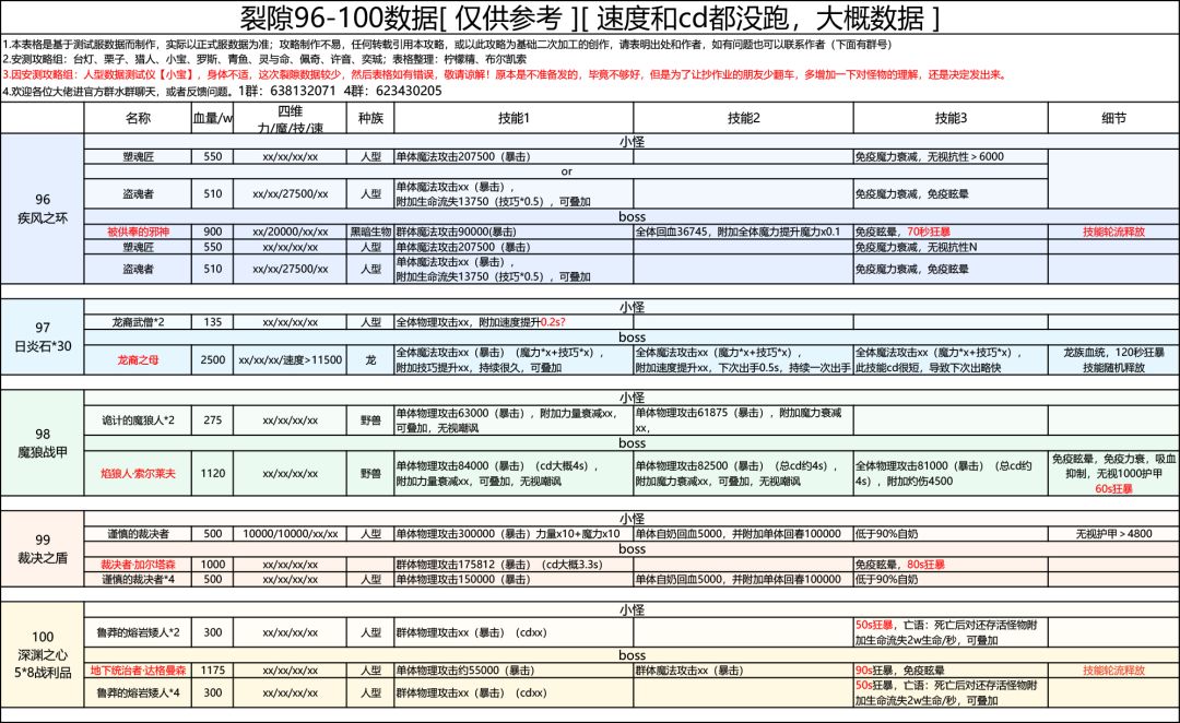 wiki上的裂隙数据没有写的很清楚,比如98的boss是有较高无视的,所以从贴吧找来了一些更详细的数据 不过配装按wiki来打是绝对可以过的,只有一些补充 96 低配用统领双操诡术圣殿,这里其实诡术设置血量最低可以挂机好一会,像我敲一下左边8.3w,前面20多秒都可以不操作诡术,直到右边血量不是最低再手动,降低了手动时间也能减少失误的发生, 高配不用统领,诡术凑高技减完需要心灵9433技,可以多上