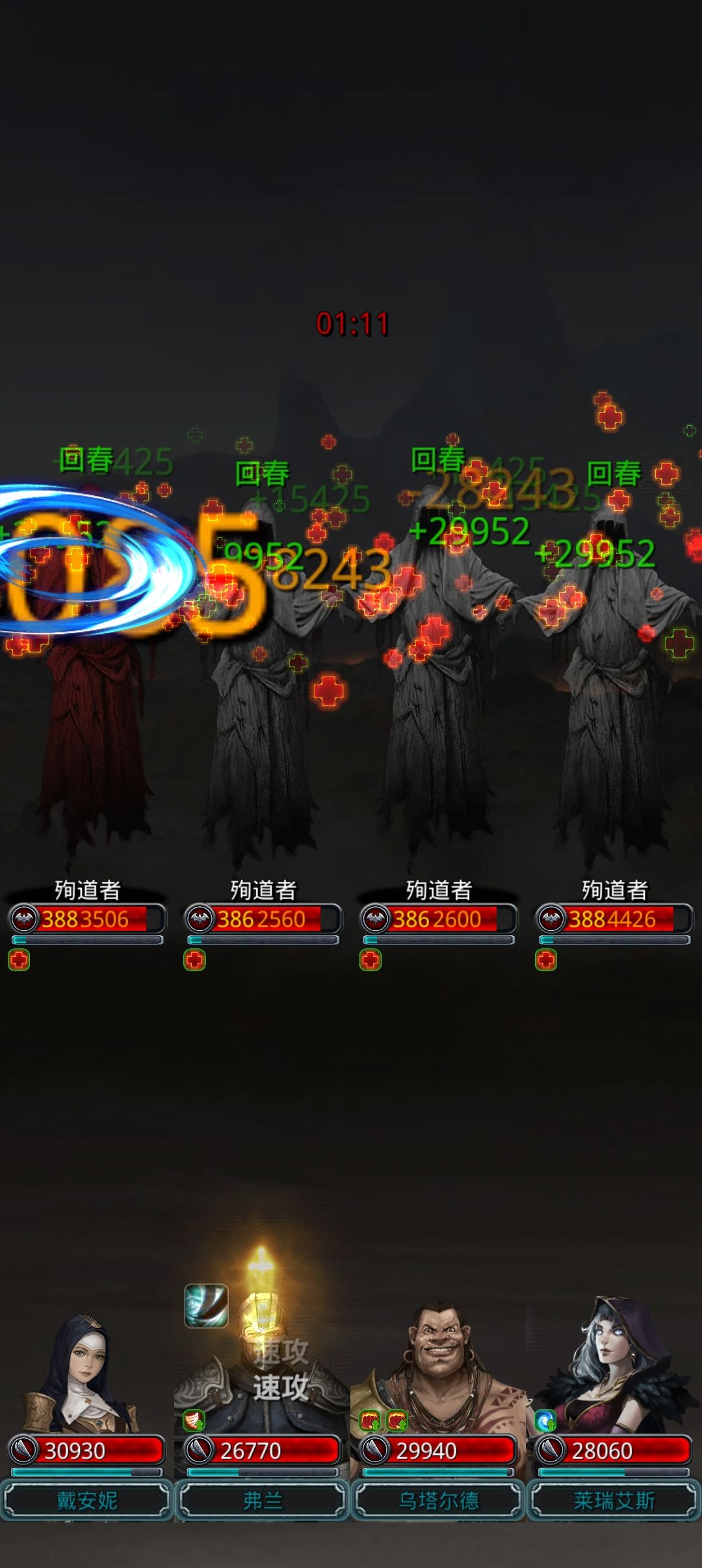 日阶火法跟圣殿,月阶黑骑跟巫医,打boss时火法一直最高血一直输出就行,圣殿1%血,巫医手动,只要boss攻击一次黑骑,不用看的,黑骑肯定重伤,圣殿拉起来后巫医直接治疗,巫医全程手动,只要boss攻击一次,黑骑被拉起来后就要给治疗,圣殿自动拉起黑骑后还要补一次治疗给黑骑,不然黑骑一样抗不住,总结下来,我打的时候全程看boss读条,读条一满,巫医治疗,圣殿手动给一次然后换回自动,一直循环就行,巫医不