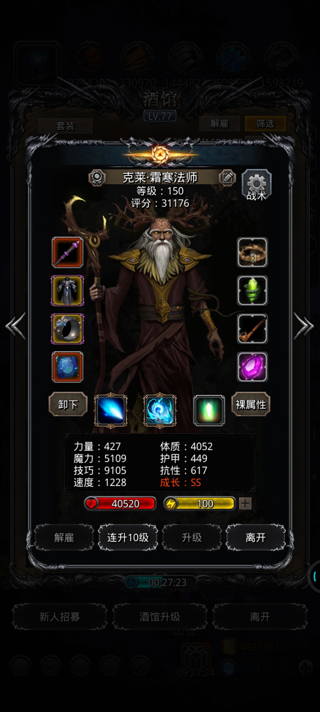 配置如下,主要虚空减力27500,龙猎适当堆力。打boss时,boss血量最低改虚空设置,圣殿少晕一个人没事,剩下就是刷脸,多出龙猎衣服特效。一把差50W,看广告复活一分半过,就tm离谱。