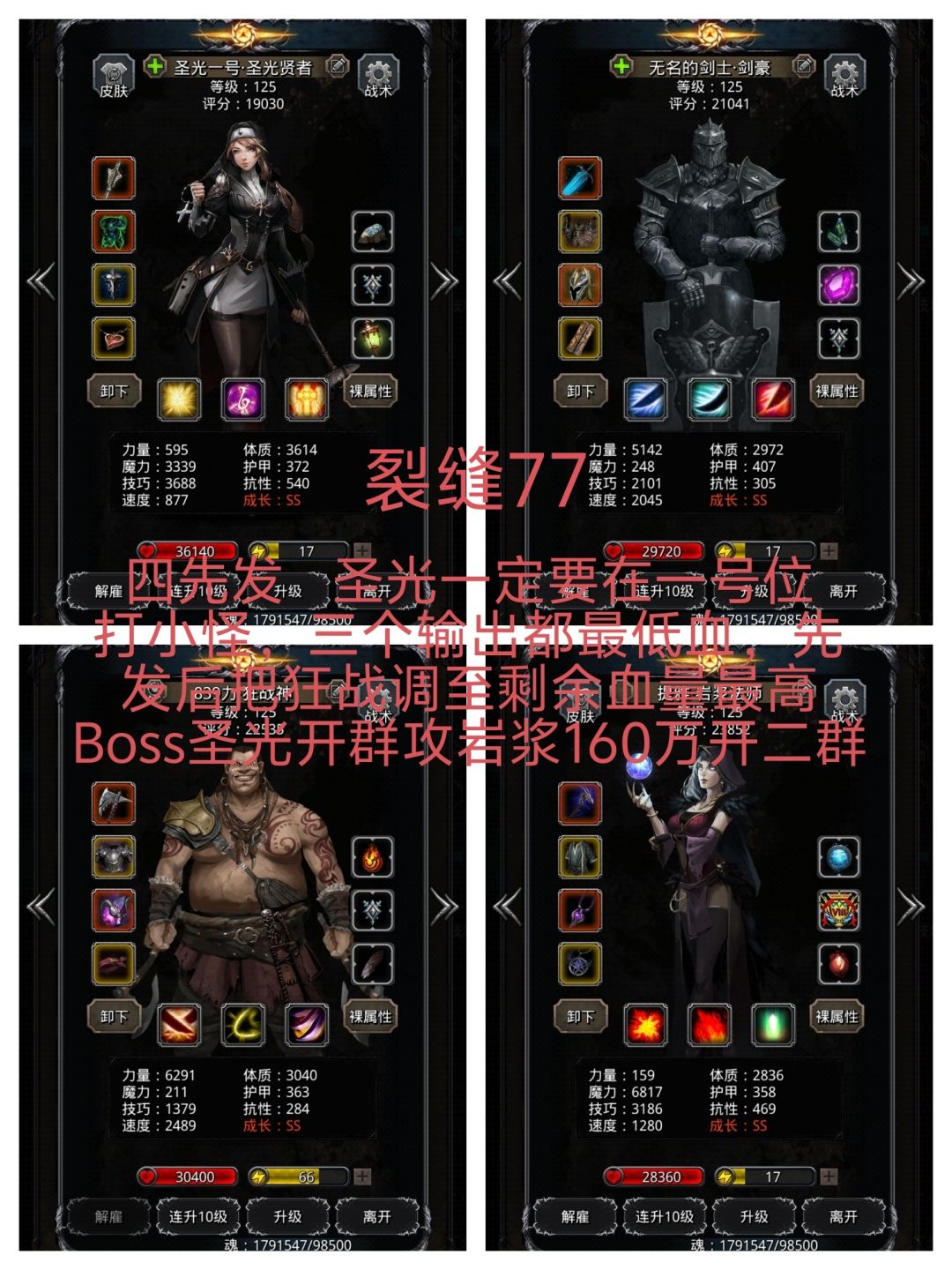 小怪设置:黑骑只嘲讽,圣枪射击,巫医瘟疫,圣骑100%奶队友 BOSS设置: 黑骑:嘲讽,每次被重伤拉起来之后补嘲讽(可以不带先发) 圣枪:射击,攻击总生命值最高 巫医:回春,1%治疗队友,每次拉完黑骑重伤给BOSS补个瘟疫 圣骑:19%治疗队友,奶线视巫医单次奶量和黑骑体力值有关,保证黑骑被拉起重伤后圣骑能立马奶一口。 一直操作到BOSS死后,改成小怪设置,挂机约10分钟过。