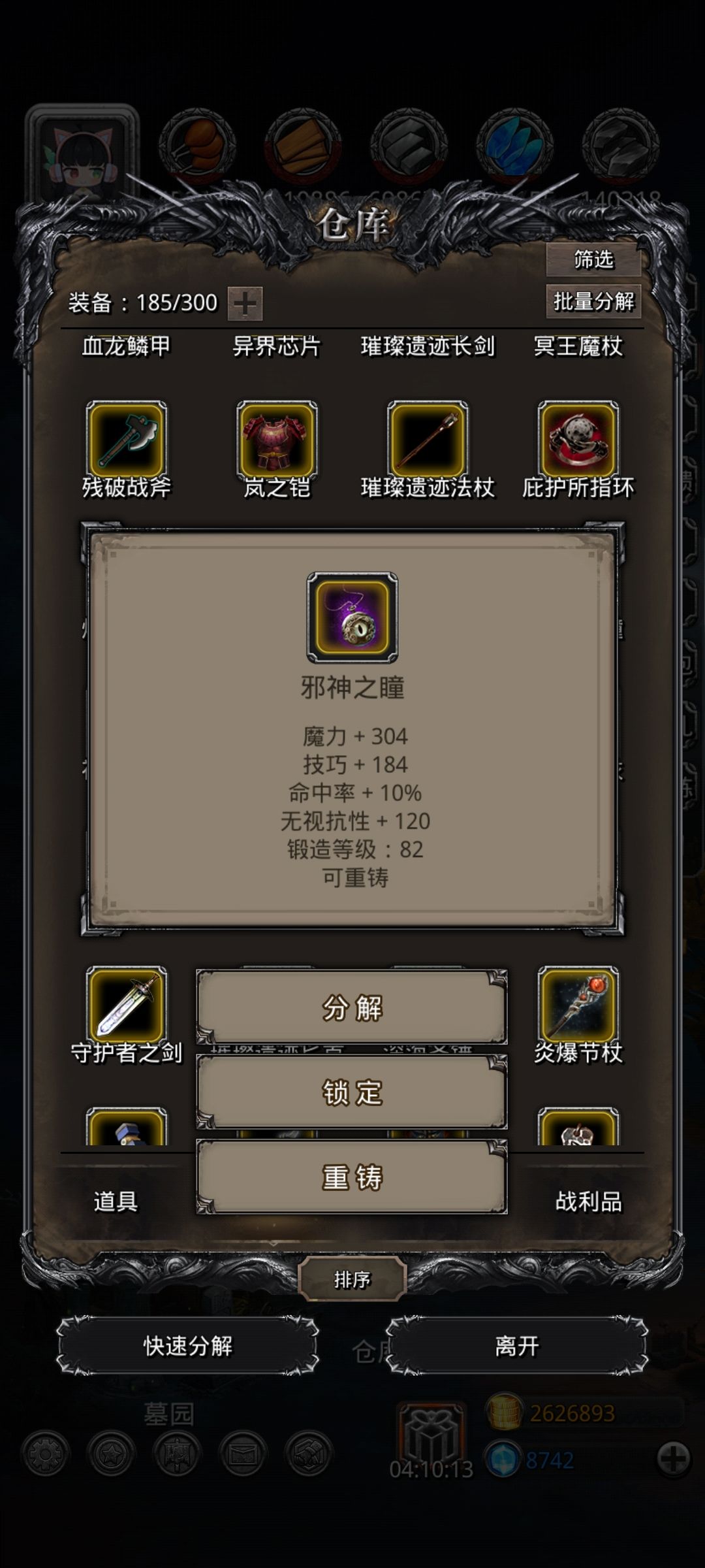 事前声明本人平均等级40锻位28,没有浩劫百臂,只有一个先发,属于低配攻略,略吃一点操作和运气,比我练度低的朋友真挚建议不要过于急功近利,好好发育几天再来挑战,当然你要刷脸我也不做反对 沙之主技巧较高,闪避收益不好且灼烧单攻很致命,所以增加部分防御穿火甲,防止群攻被晕无法挽救,除去圣骑外祭司巫医输出携带免疫抗性衰减的装备减轻小怪威胁,两个龙晶坠一个魔剑士戒指(裂隙39刚需两个龙晶坠,毕竟冬甲属性太