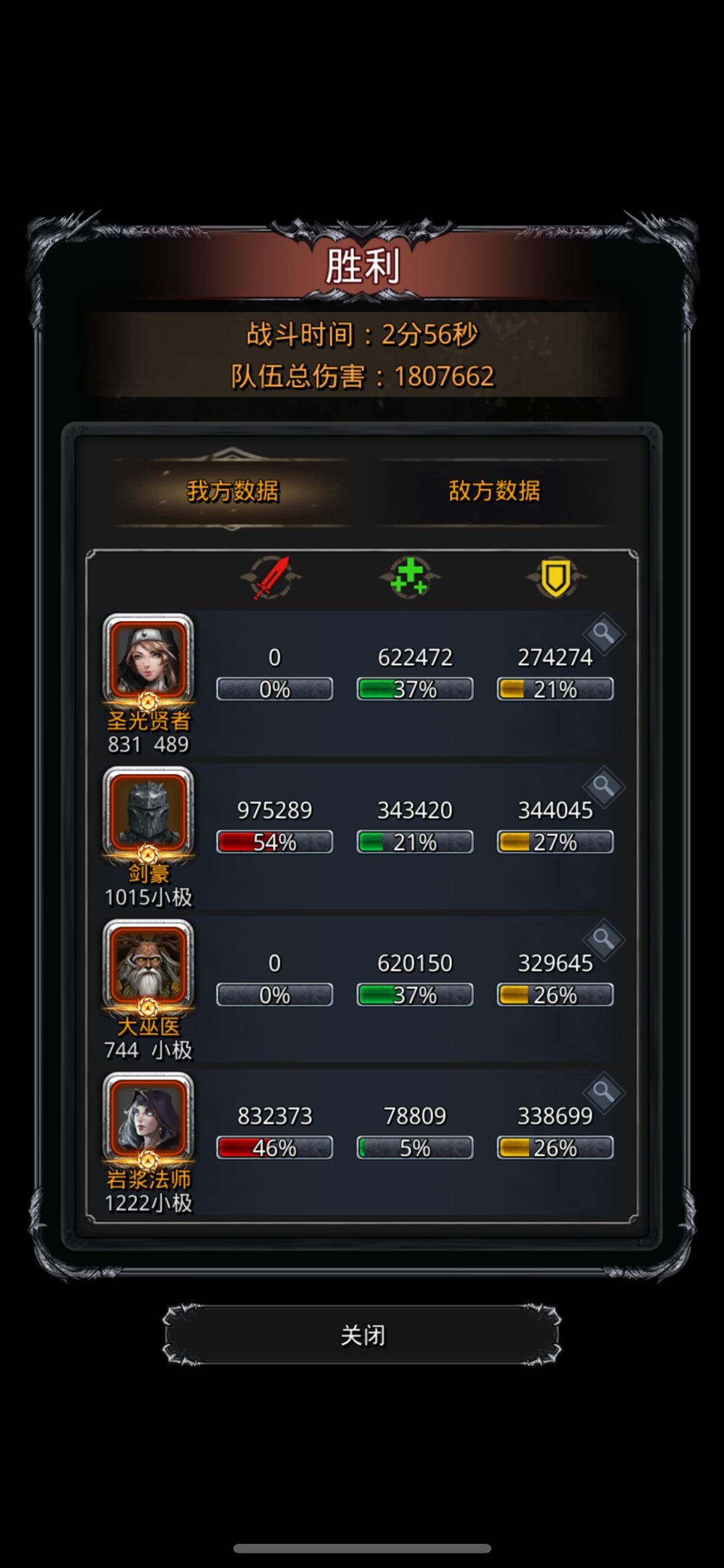 你敢信我连续四把没被吞重伤,要不是前两把蛮子没带魔神斧还是吞的夜莺我可能早就过了[表情_捂脸哭] 按战力测试打,最佳阵容双狂战火法夜莺重伤夜莺(幻境法是给氪佬们准备的,我们就老老实实刷伤害吧),其次狂战火法夜莺夜魇重伤夜魇,伤害方面蛮子(有命中)>火法>夜莺>夜魇,由于boss有1500速度,命中远比一点属性重要,打不中等于白玩,所以夜魇在没双抗的裂隙中极其尴尬,所以把他开局重伤赌吞噬不死,控制血