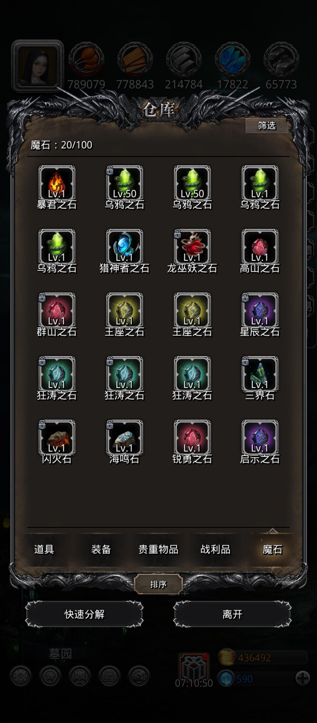 魔石就这些,战利品魔单吸两个,物单吸三个,主线卡在图25伊兹玛尔,裂隙卡在80,锻造103,英雄满级的不多,太缺魂了,看了眼图24的攻略,我缺个蛮荒,现练等级也上不来,是不是用图23攻略好点,除了通魔甲都有,攻略里龙杖还能换成枯叶⭐️。