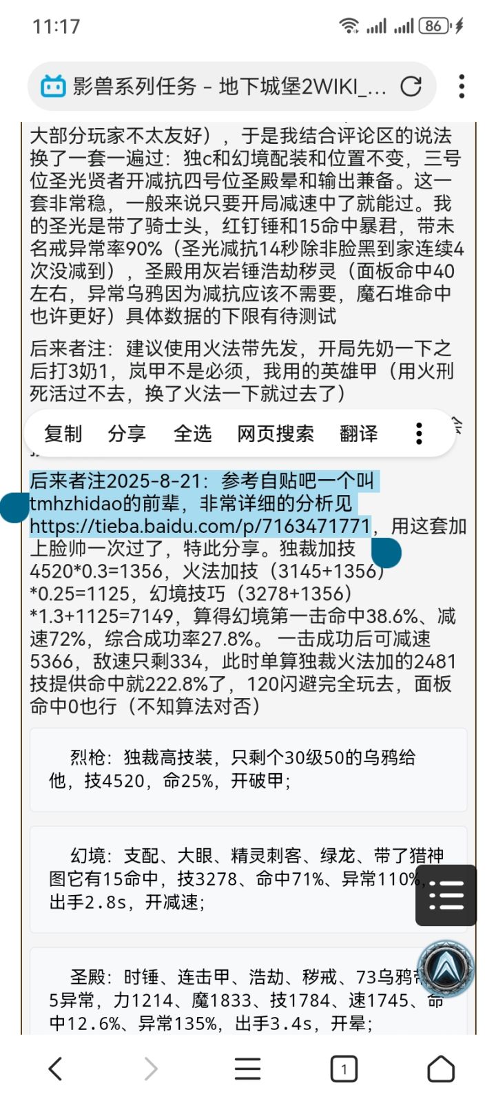 参考的是图里链接帖子里的配装,总共刷脸6次,第6次挂上减速就过了。站位要求独裁最左法师第2。圣迹枪法奶52 67 74锻造88参考配装独裁枪:70技巧保底魔石,11技巧石头+星国火种火法:78魔37技巧古精灵,11.2魔石头+3.2魔先发幻境:67技巧12命中魔石,9.7命中+9.2命中圣殿:10命中监牢魔石,8命中+9命中