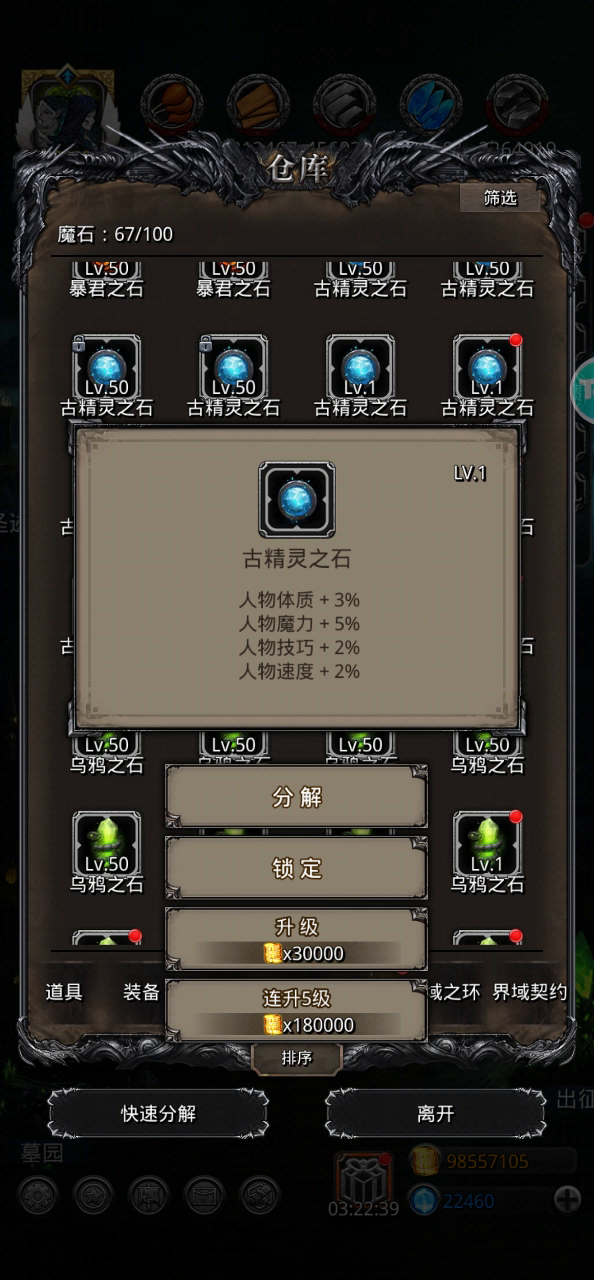 选择升级原则为主属性的double,数值没到立马放弃,及时止损。 因为魂石储备较少,期待爆种的赌性较大,有几个魔石应该及时止损的,期待太大导致多损失了些金币。