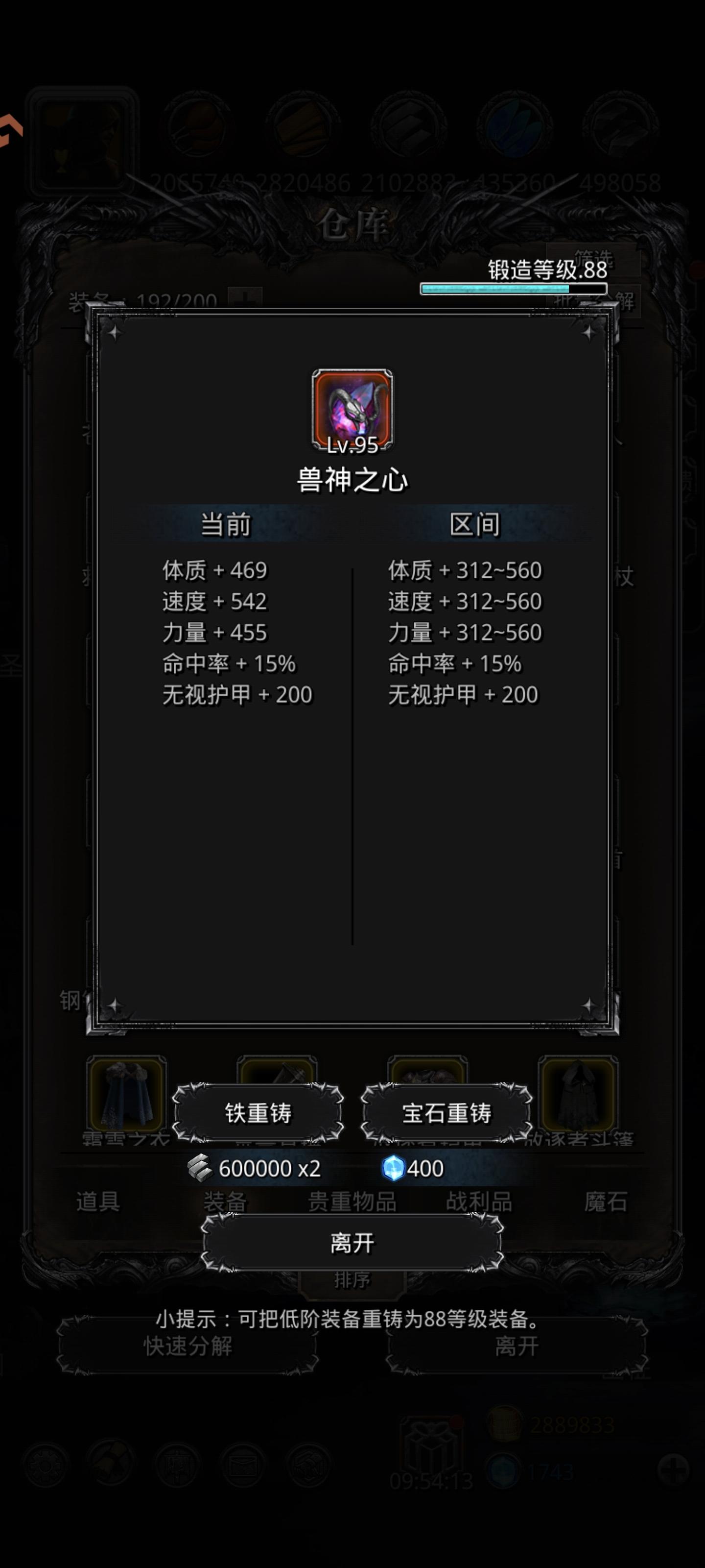 只要状态和复仇够,这BOSS就是个菜。中间有天忘打了,最后打战鬼又刷了2个88+的乌鸦,一次过了。乌鸦共4个88+,技巧战利品2个10、3个9、3个8+,遗迹状态90、复仇145,祭司加抗7W+完全溢出,到5W就行。战鬼这属性,看着比兽心提升不大,并且加技巧不加速,感觉更适合剑豪啊!