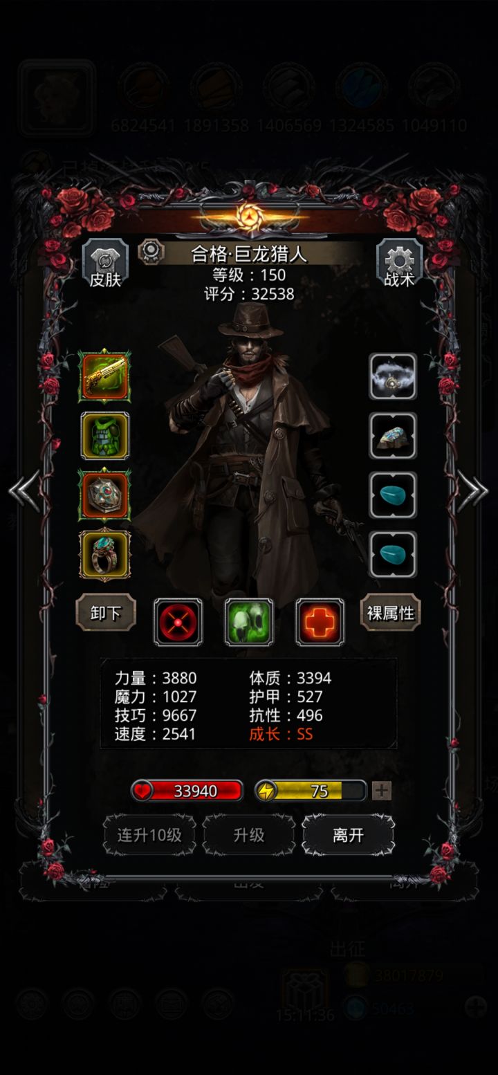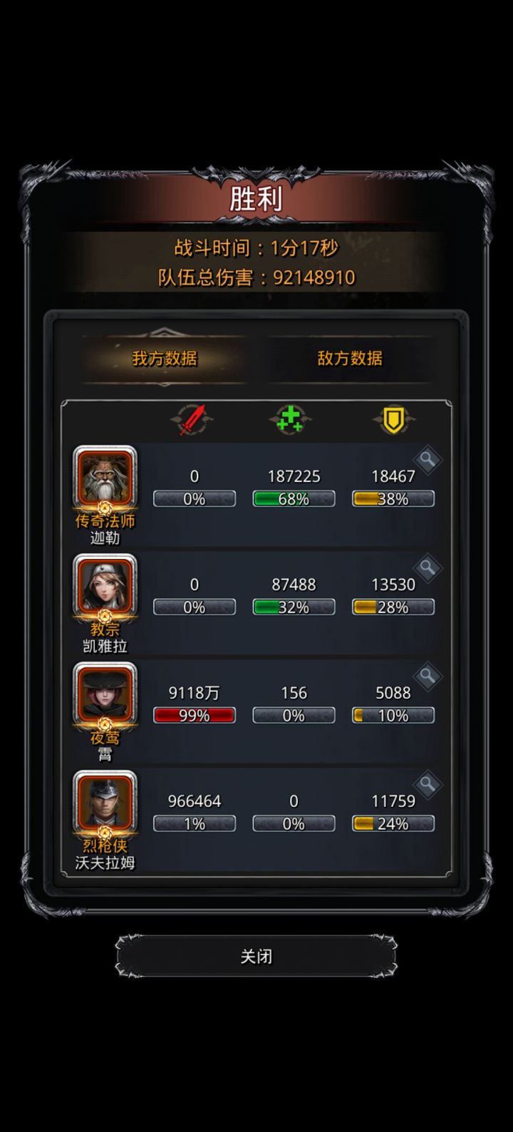 只要状态和复仇够,这BOSS就是个菜。中间有天忘打了,最后打战鬼又刷了2个88+的乌鸦,一次过了。乌鸦共4个88+,技巧战利品2个10、3个9、3个8+,遗迹状态90、复仇145,祭司加抗7W+完全溢出,到5W就行。战鬼这属性,看着比兽心提升不大,并且加技巧不加速,感觉更适合剑豪啊!