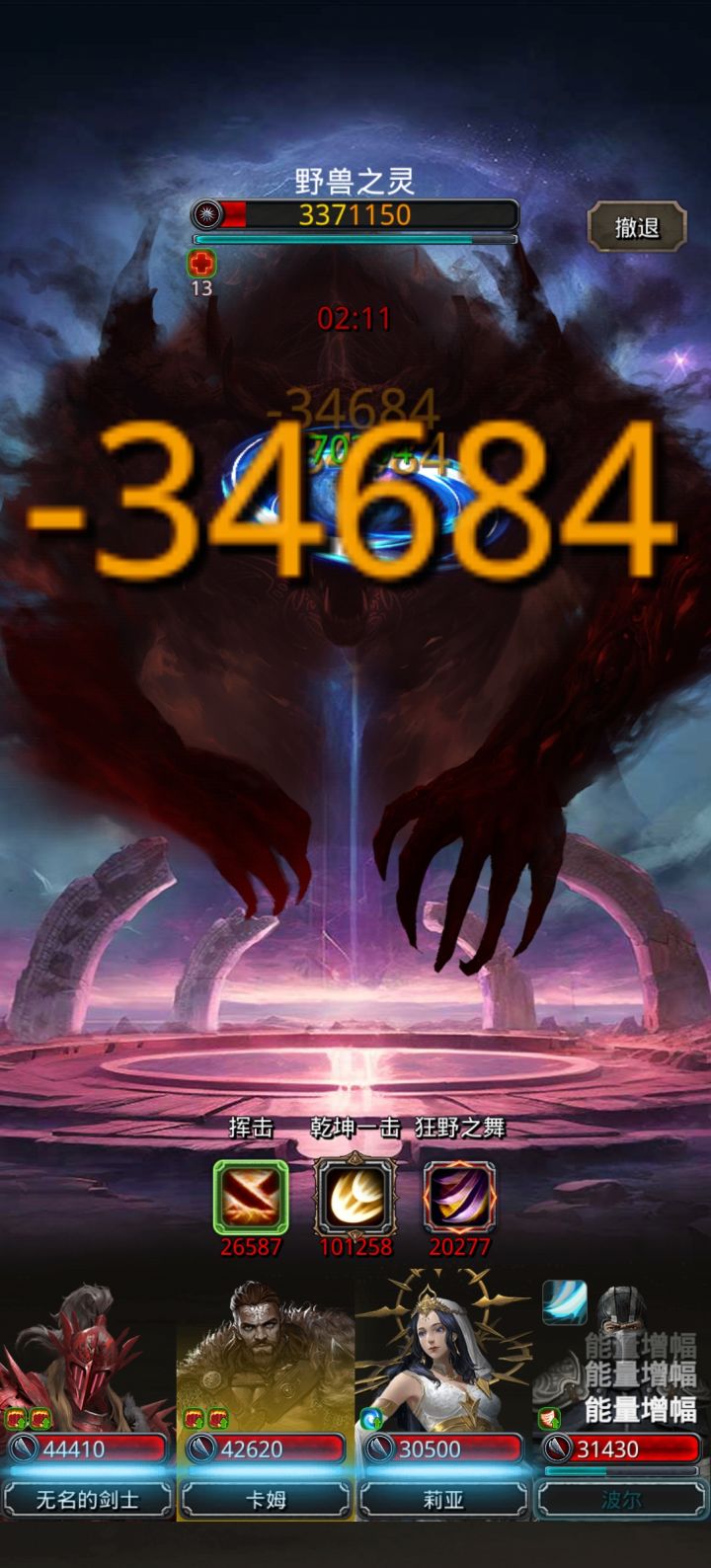 图36最终BOSS,32院长+不死冥虫/裂隙112的模式,区别是boss剩2%血(大概100万血)得“一下子打掉”,否则BOSS立刻狂暴秒杀全队。BOSS快200万血时,剑豪、狂战、魂贤切手动,靠夜魇磨血至120万左右,期间手动剑豪破甲、狂战群攻、魂贤毒或奶,主要是狂战刷出蛮族甲特效。然后,伸出你金贵的2个手指(攻略是操作3个手指加个魂贤,我操作不来),同时按住剑豪、狂战姓名框切自动,这样才能